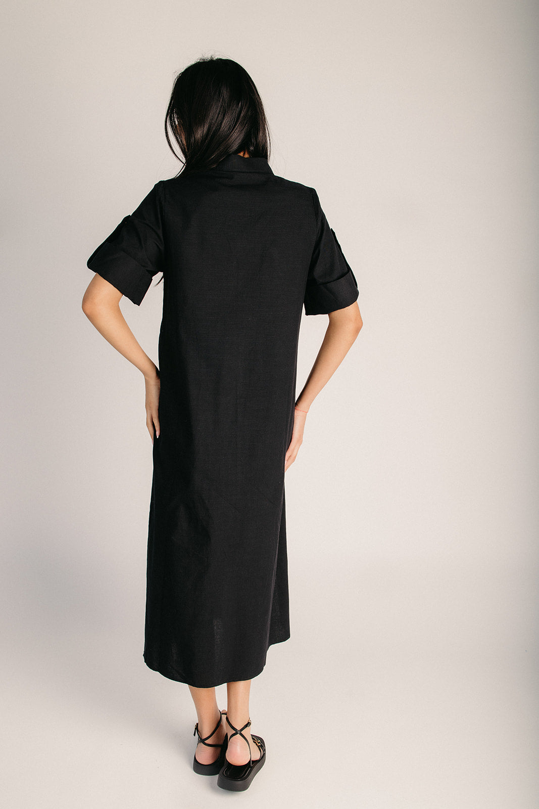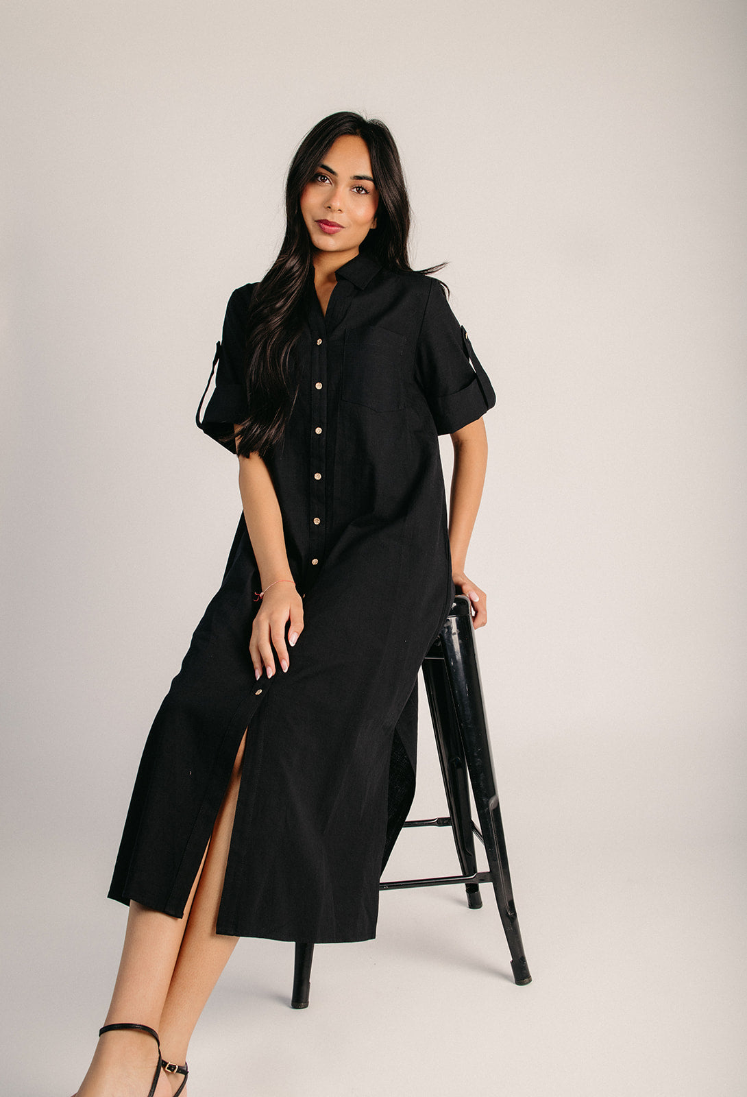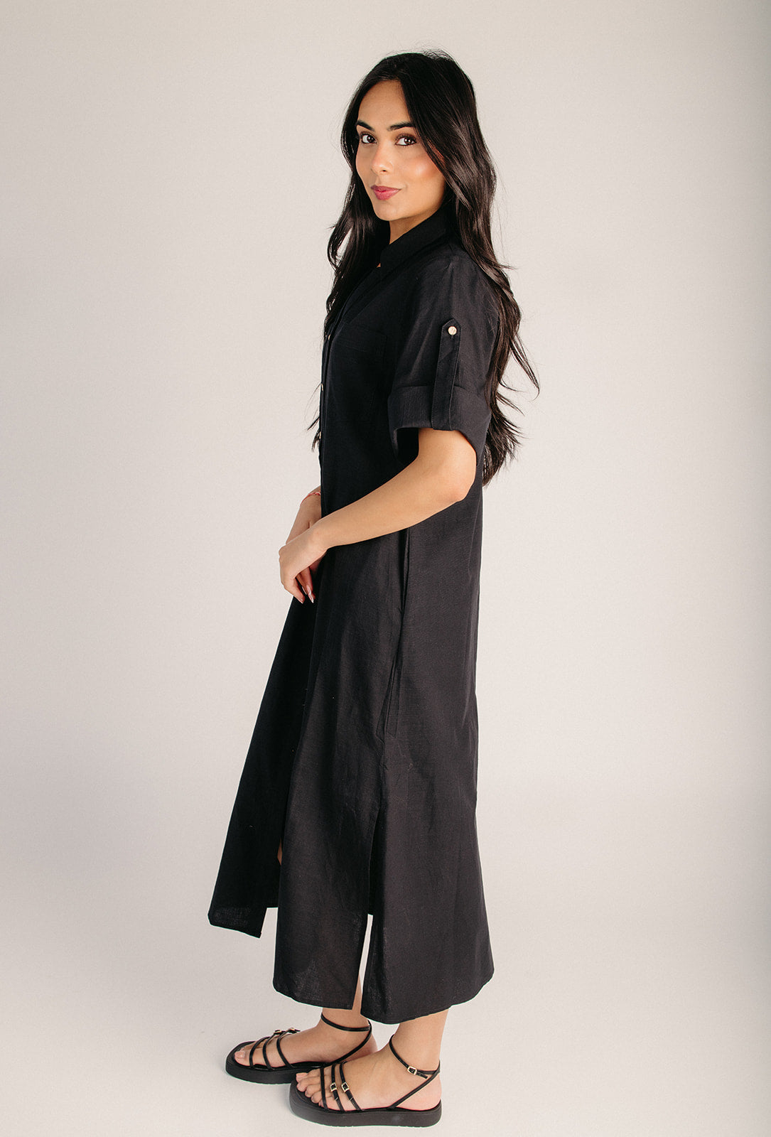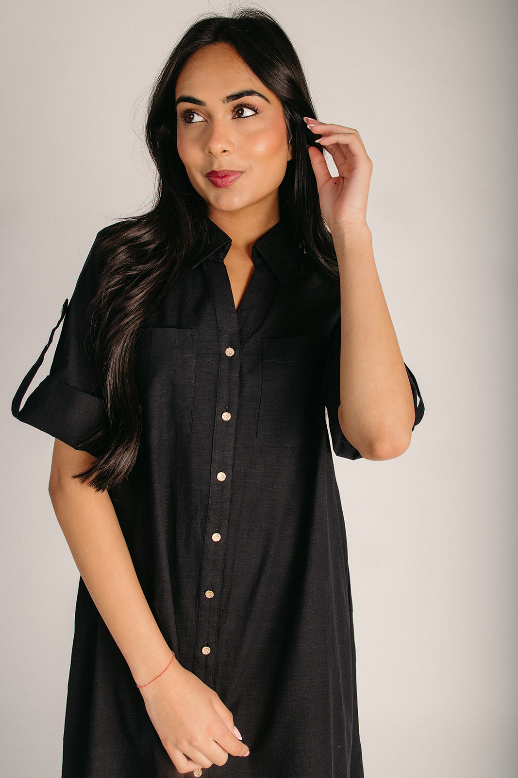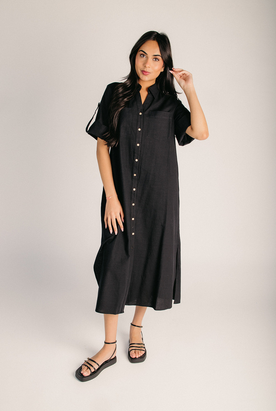 Effortlessly chic and undeniably versatile, the Covington Button-Up Midi Dress in Black is your new go-to for everything from office meetings to weekend brunches. This polished piece features a flattering button-front silhouette and midi length that hits just right. Dress it up with heels or down with sneakers—this timeless black midi does it all with understated elegance.