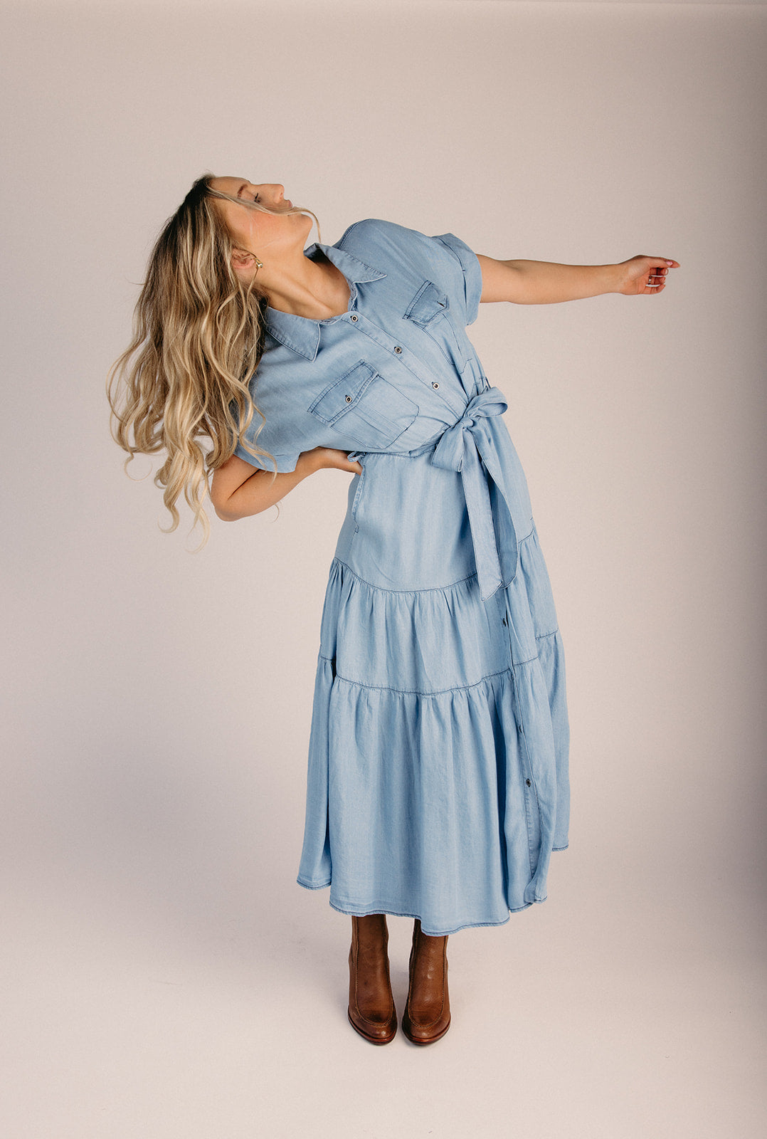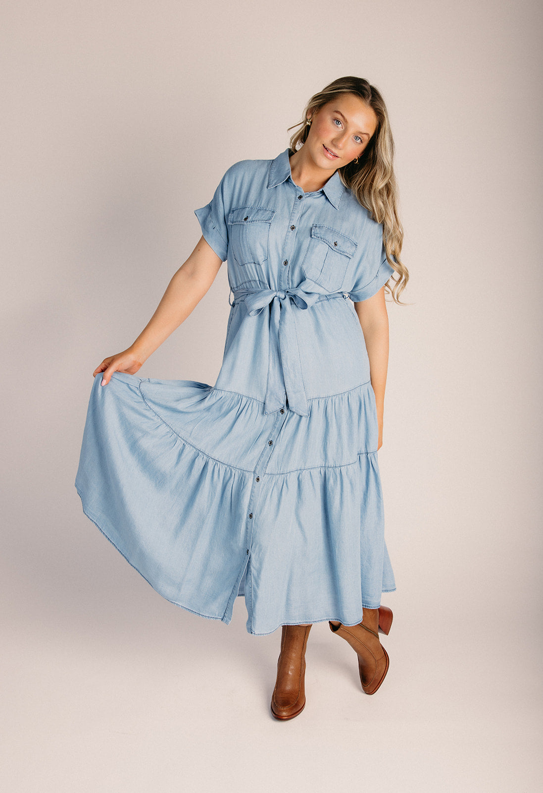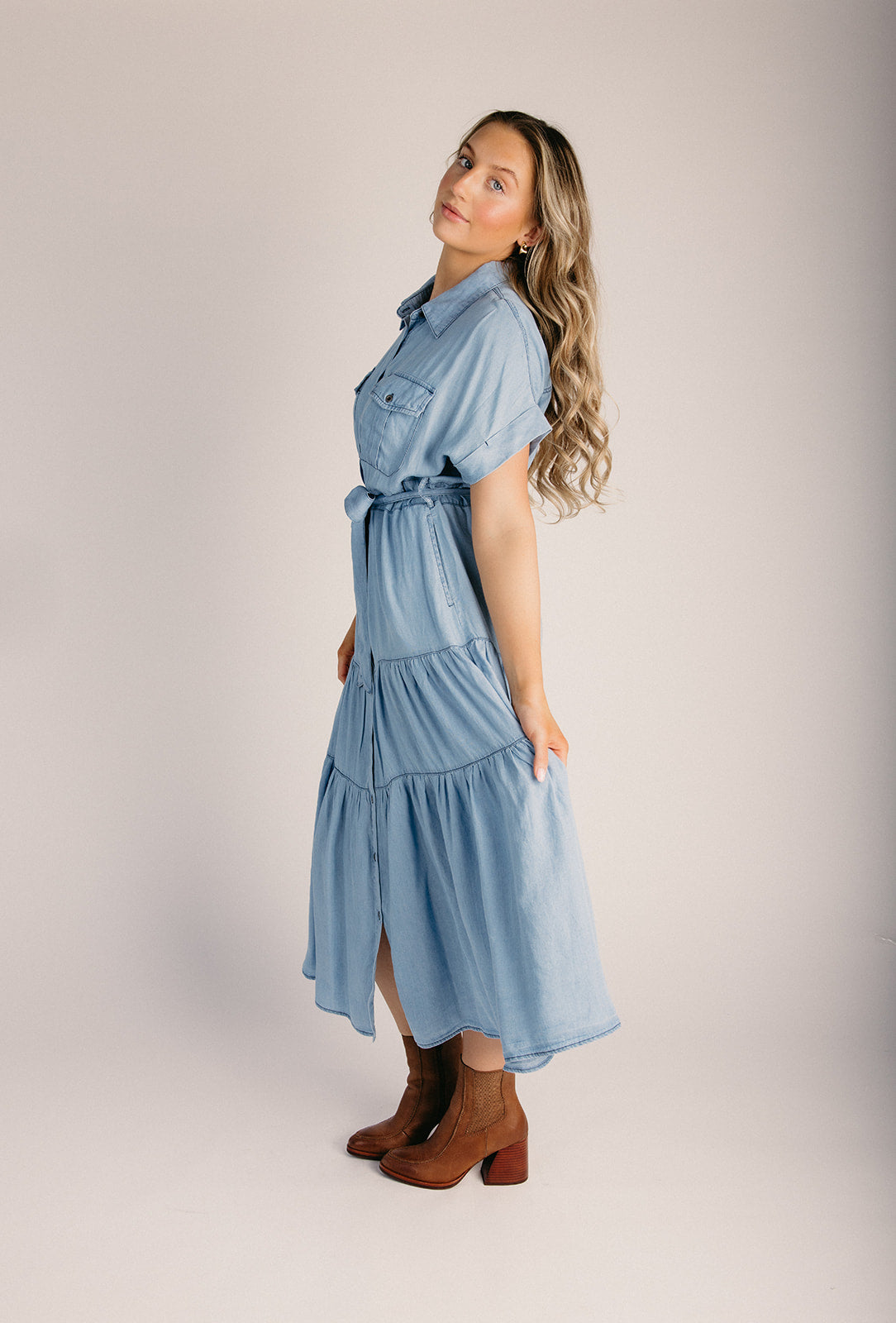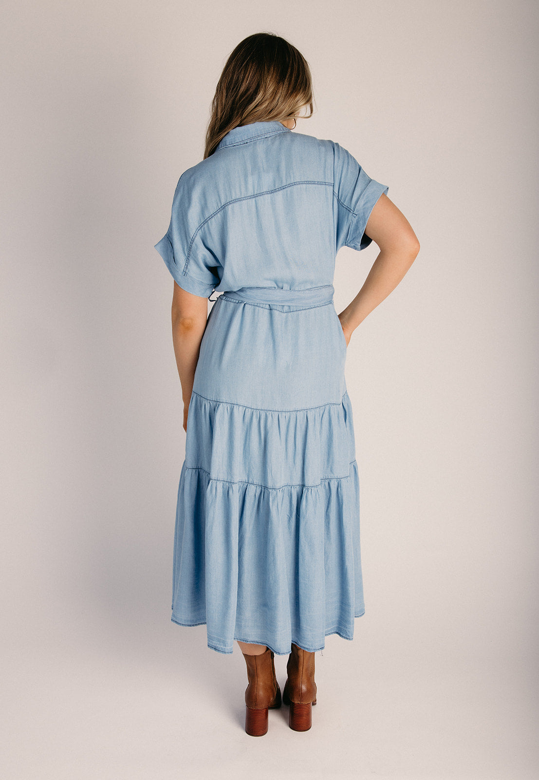 The Baird Chambray Tiered Dress in Light Denim