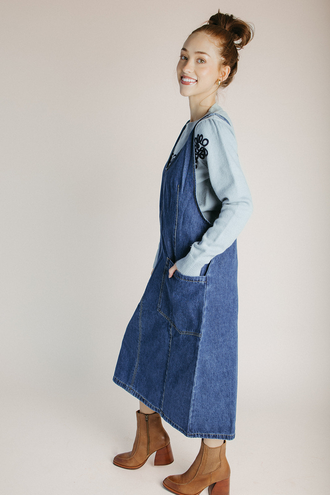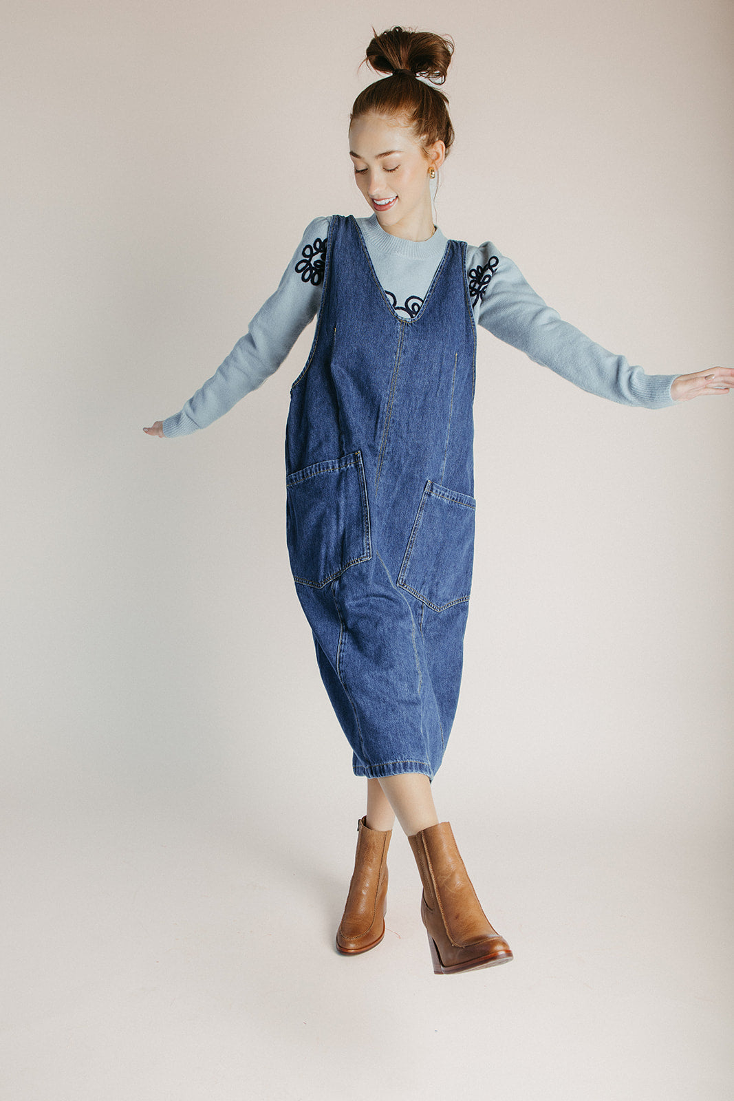 Introducing The Caffery Denim Overall Dress in Indigo Blue. This fun and quirky dress features a unique overall design, perfect for a playful and casual look. Its indigo blue color adds a pop of color to any outfit. Get ready to turn heads with this eye-catching dress!