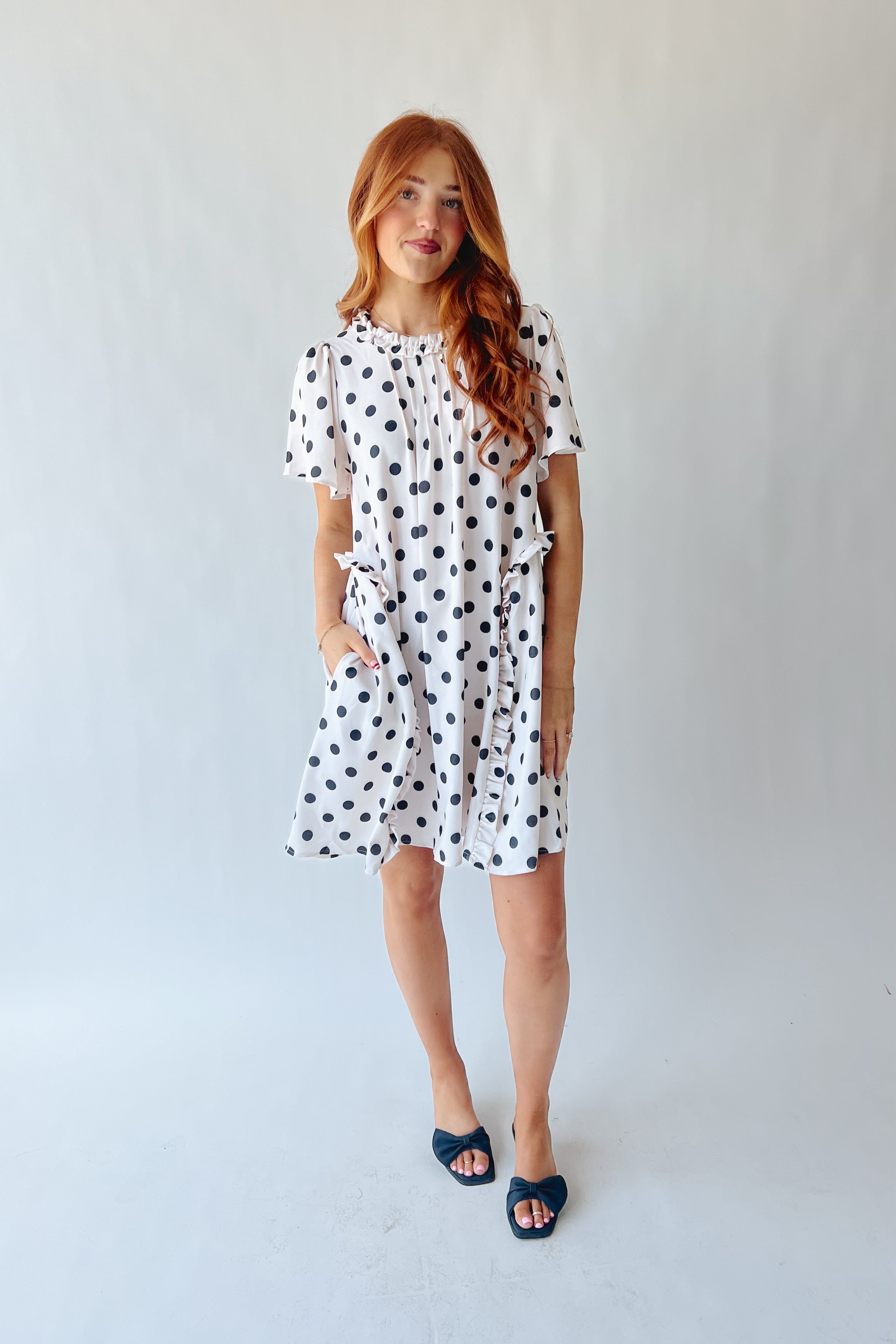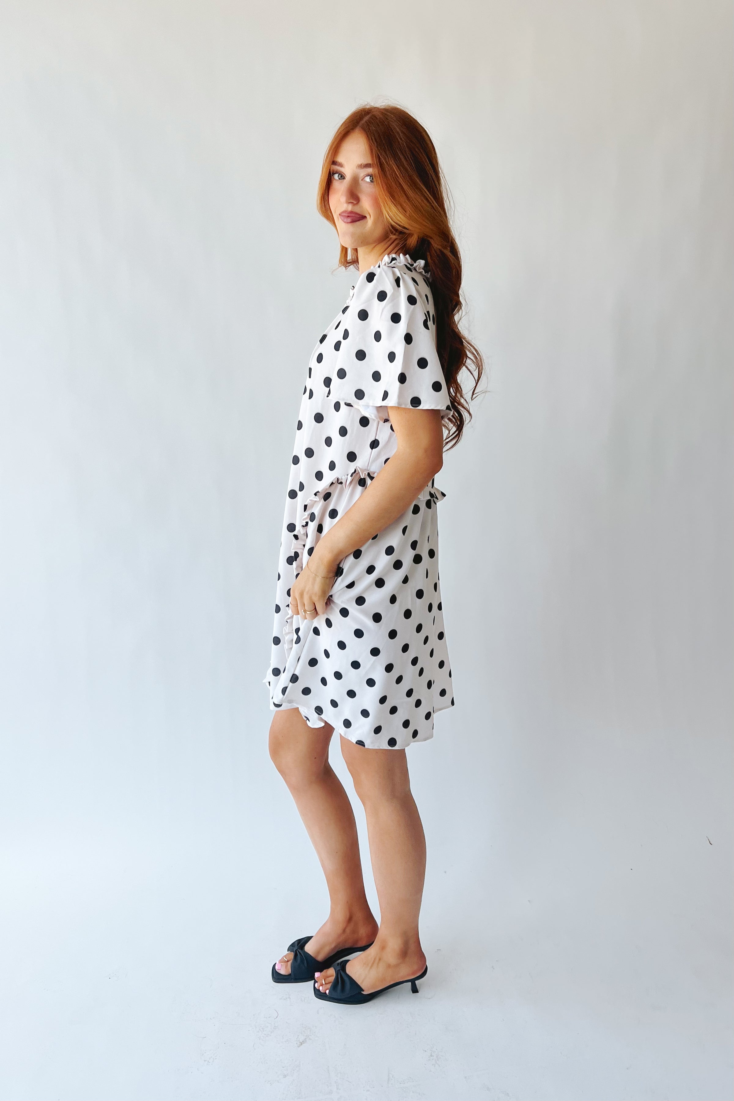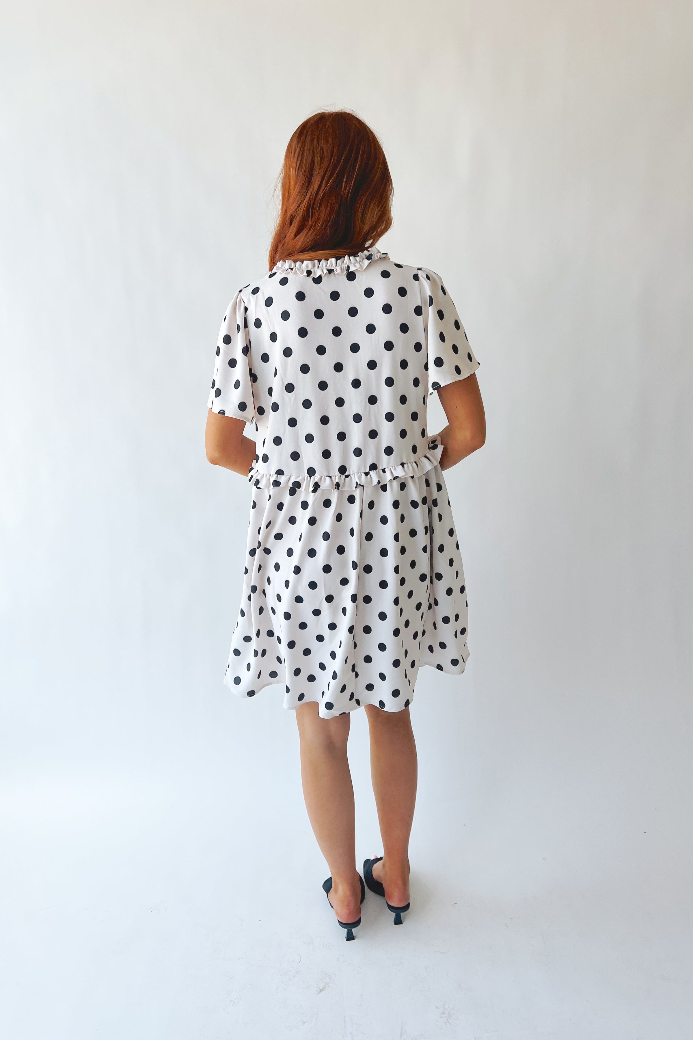 The Norwell Pin Tuck Polka Dot Dress in Ivory + Black
