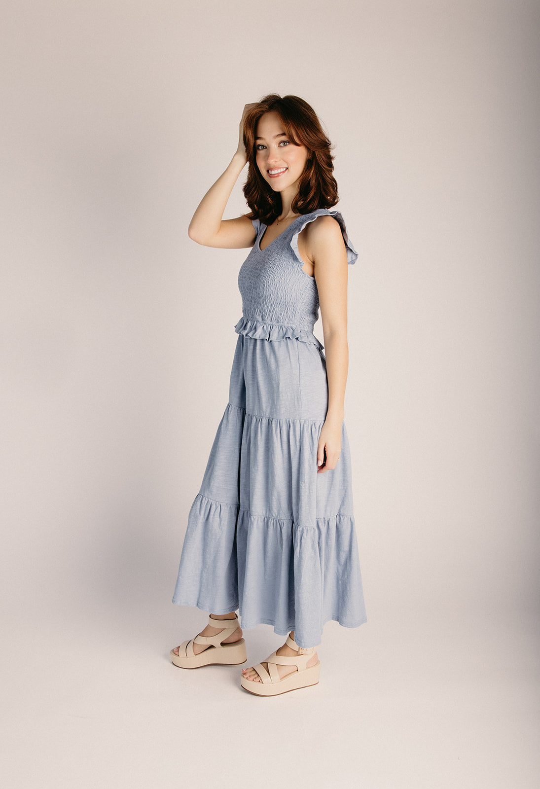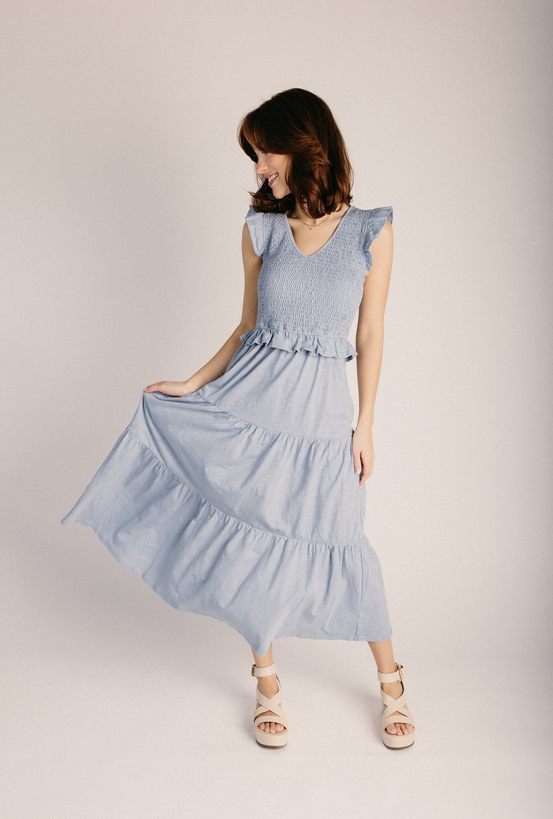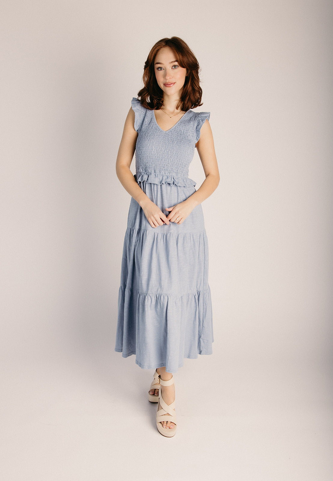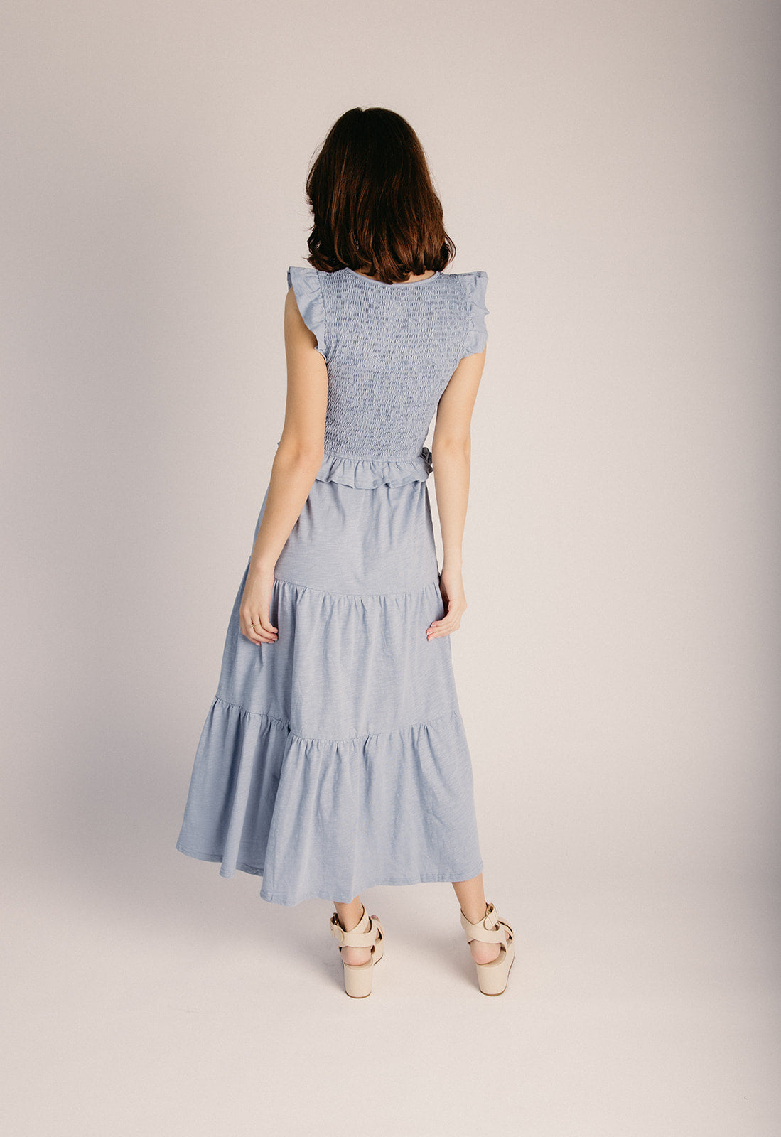 The Renfrow Smocked Midi Dress in Dusty Blue
