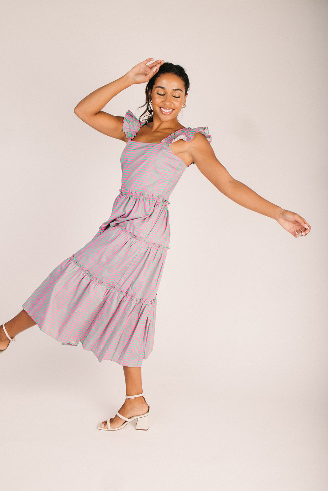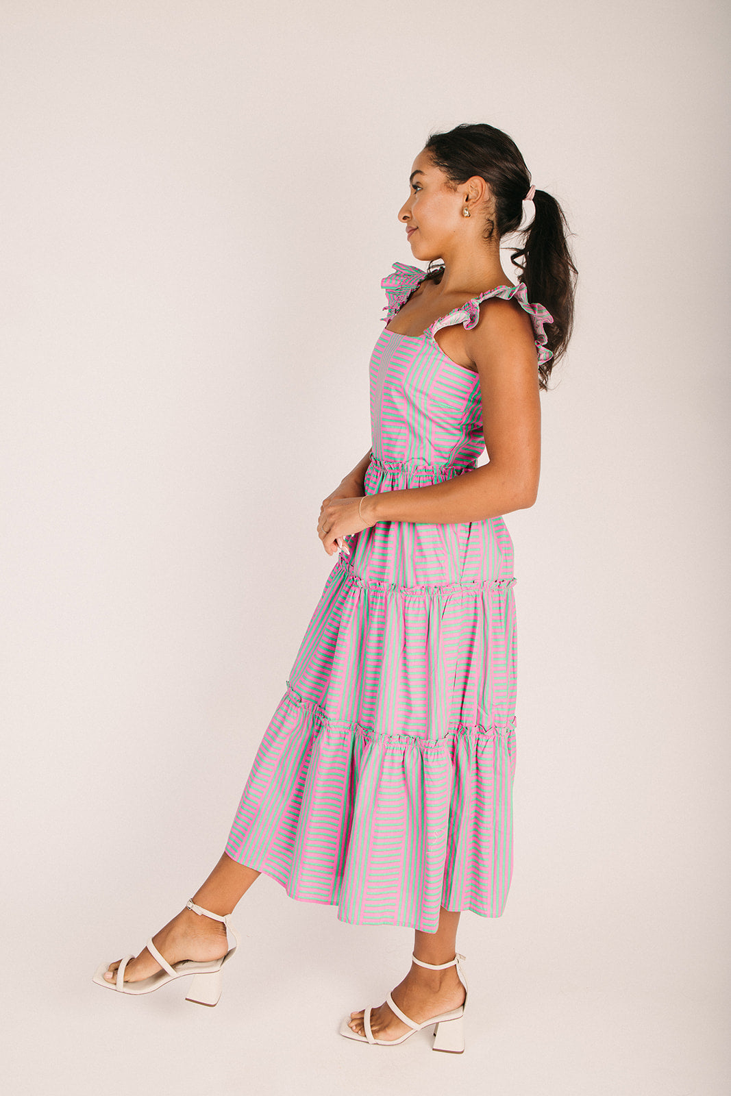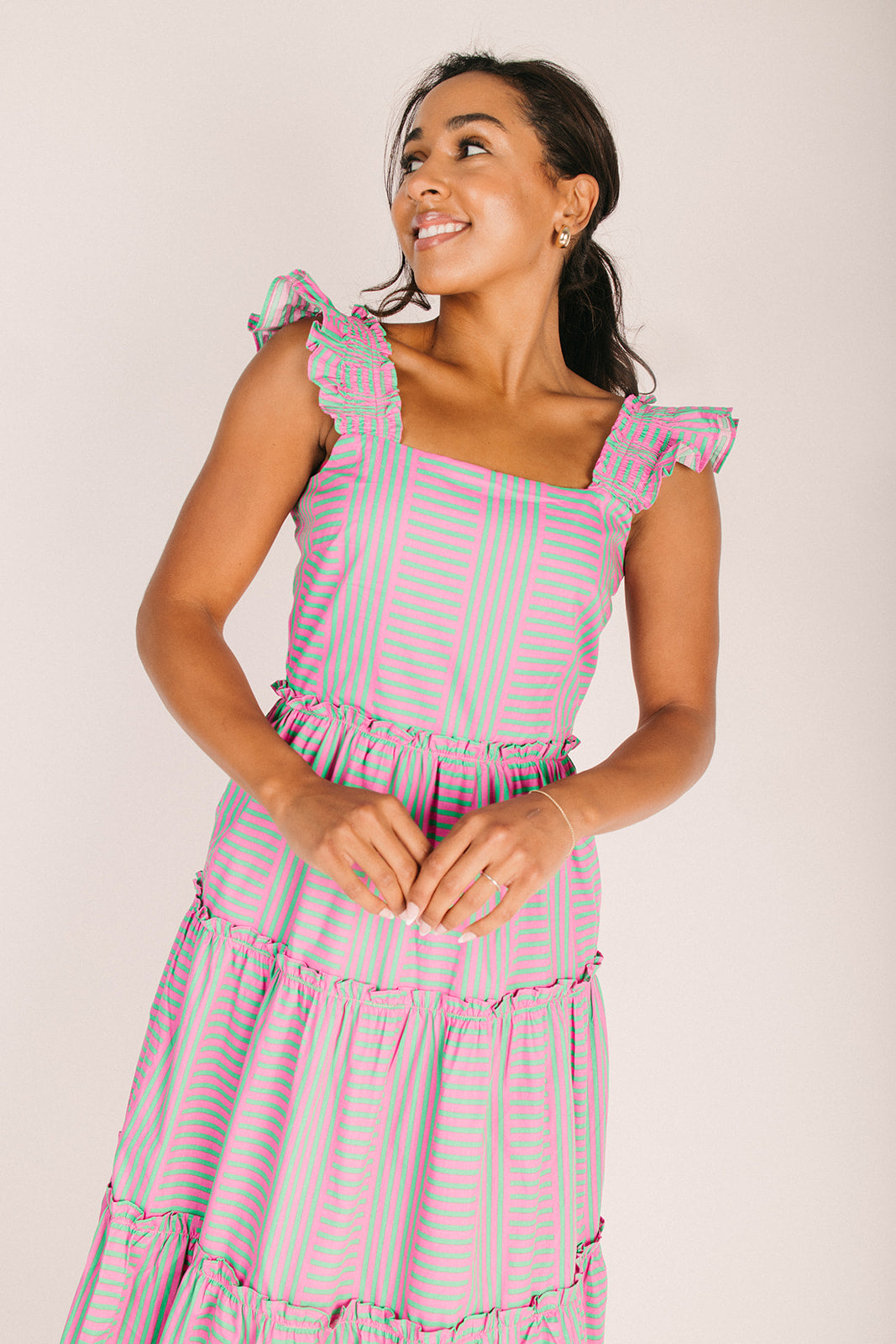 Say hello to the dress that does it all: The Valda Striped Midi Dress in Pink + Green. With its playful striped pattern and breezy midi length, this piece is ready for whatever your day throws at it. The comfortable, easygoing fit means you can move freely without sacrificing style, while those gorgeous pink and green stripes add just the right amount of personality. Dress it down with flats for everyday wear or dress it up for something special—this versatile gem adapts to your mood.