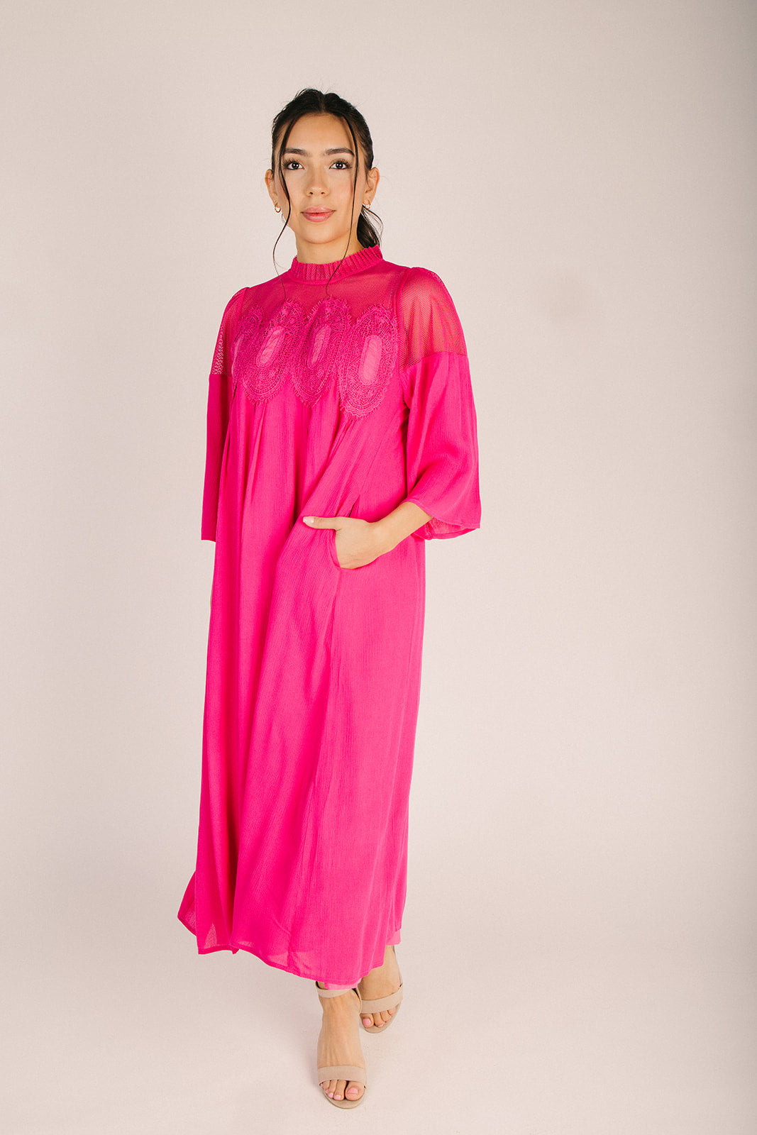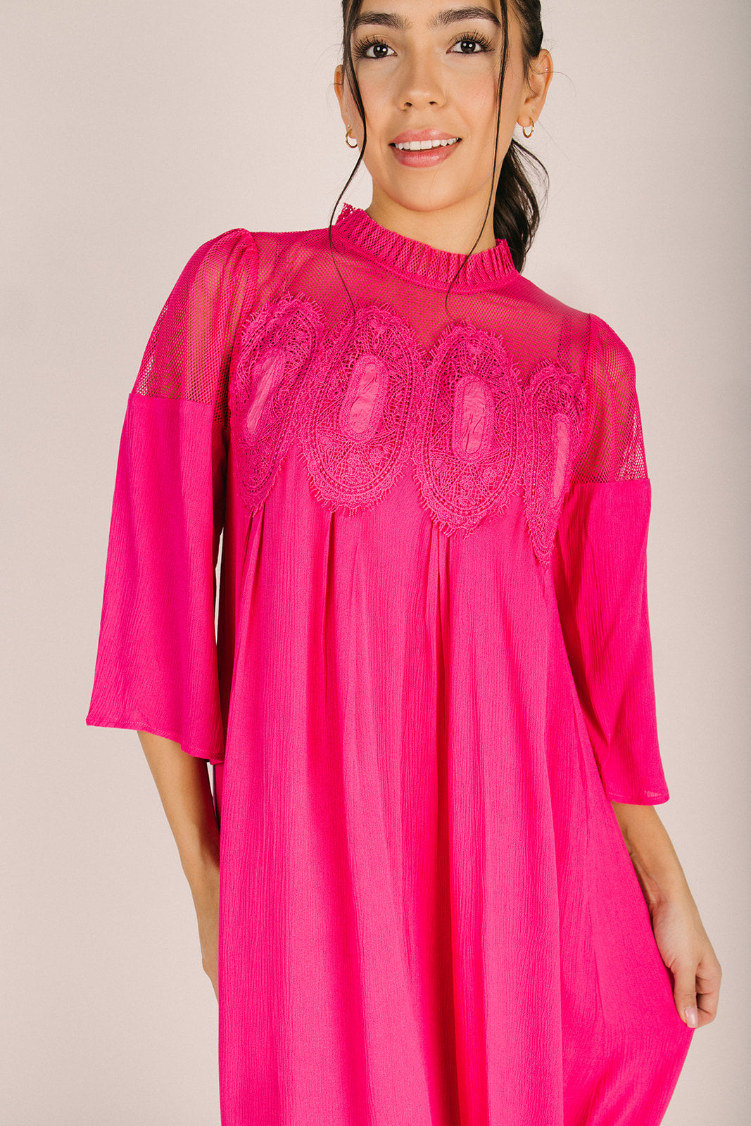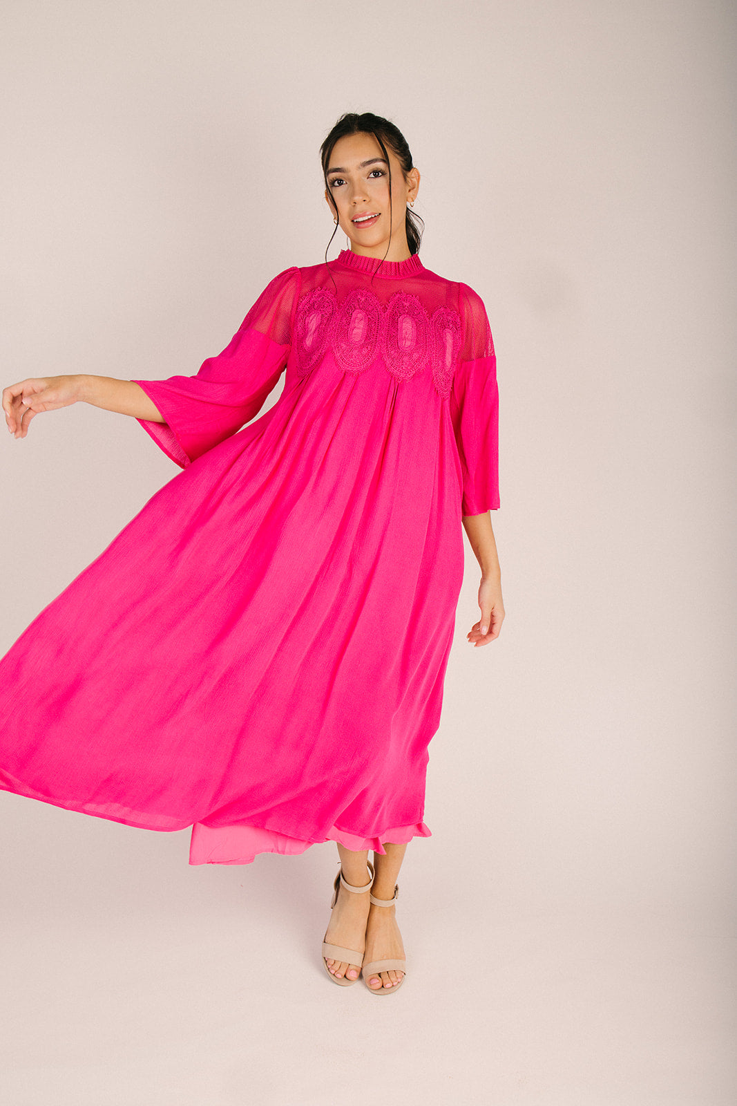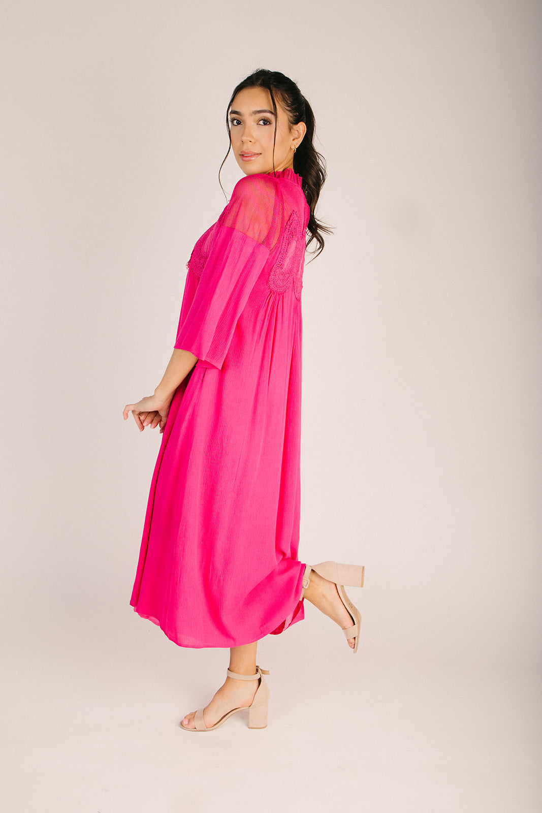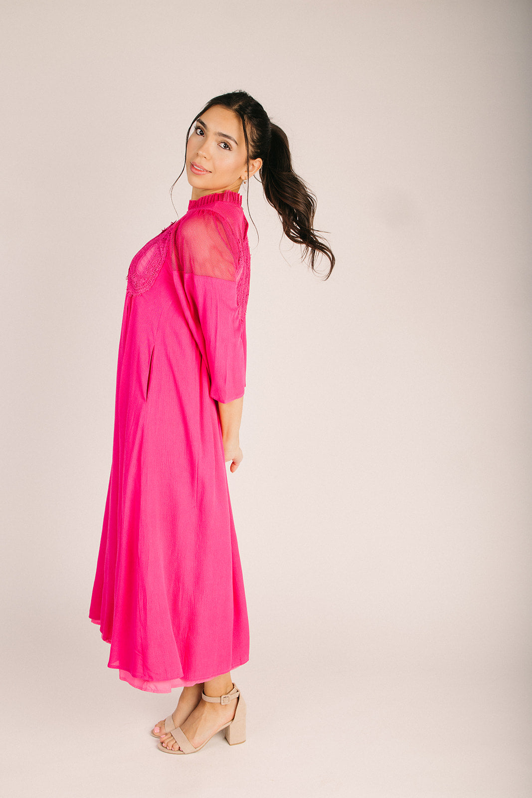 Turn heads in this show-stopping fuchsia midi dress that's equal parts bold and beautiful. The textured bodice adds dimension and visual interest, creating a flattering silhouette that transitions seamlessly from day to night. With its vibrant hue and sophisticated midi length, this dress is your go-to for making a statement without saying a word. Perfect for anyone ready to embrace their inner fashionista and stand out from the crowd.