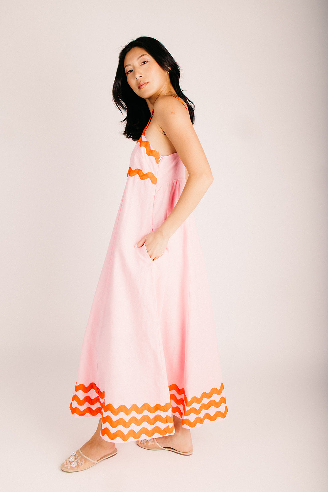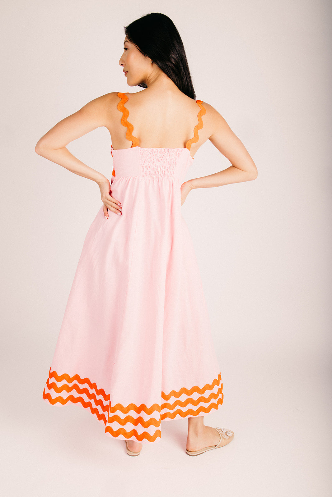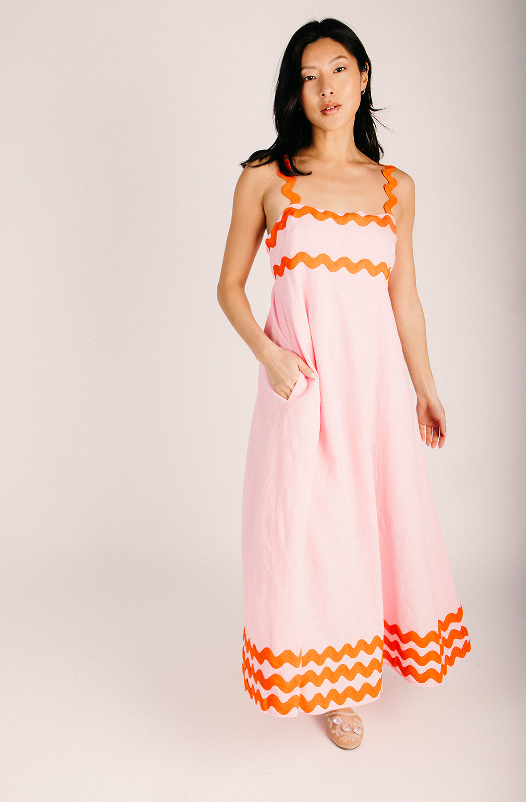 Twirl into spring with this charming maxi dress featuring delightful ric rac trim that adds a whimsical touch to your wardrobe. The soft petal hue brings an effortless, romantic vibe perfect for everything from garden parties to casual weekend adventures. With its flowing silhouette and playful details, this dress is your go-to for looking put-together without trying too hard. Slip it on and let the good times roll!