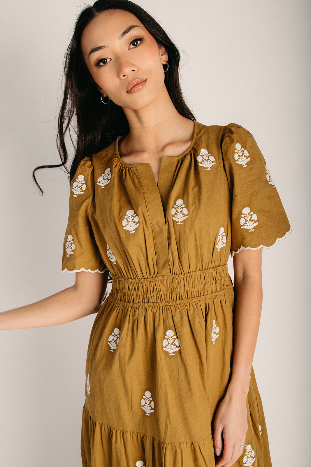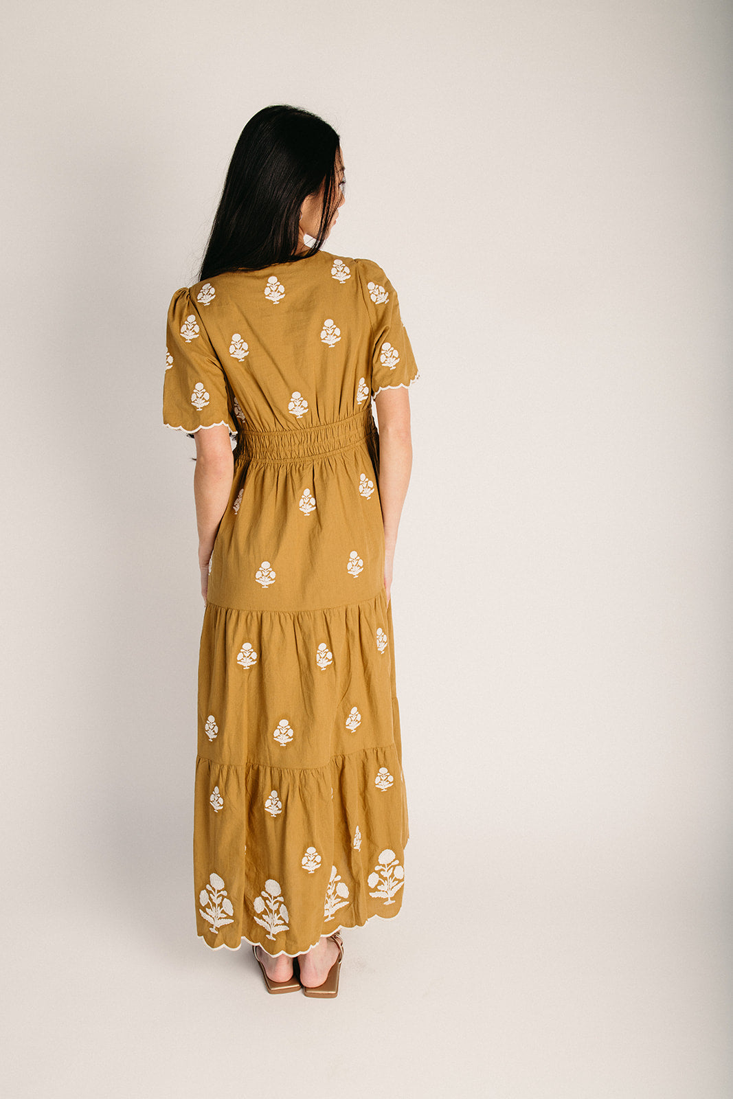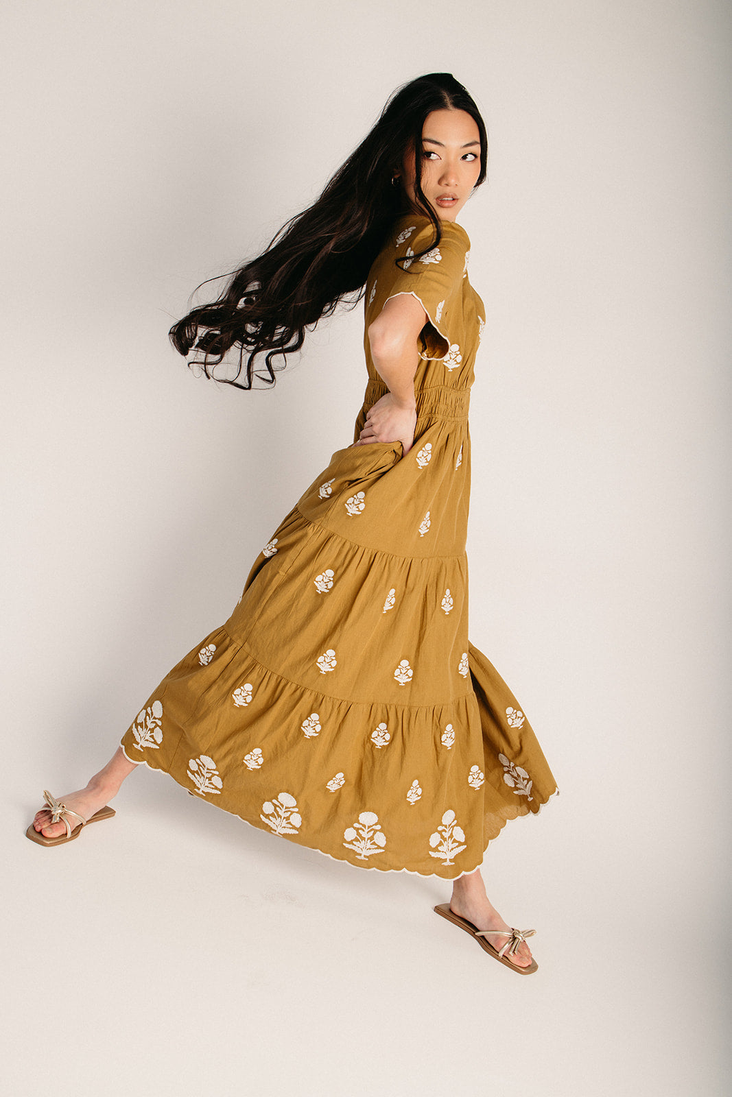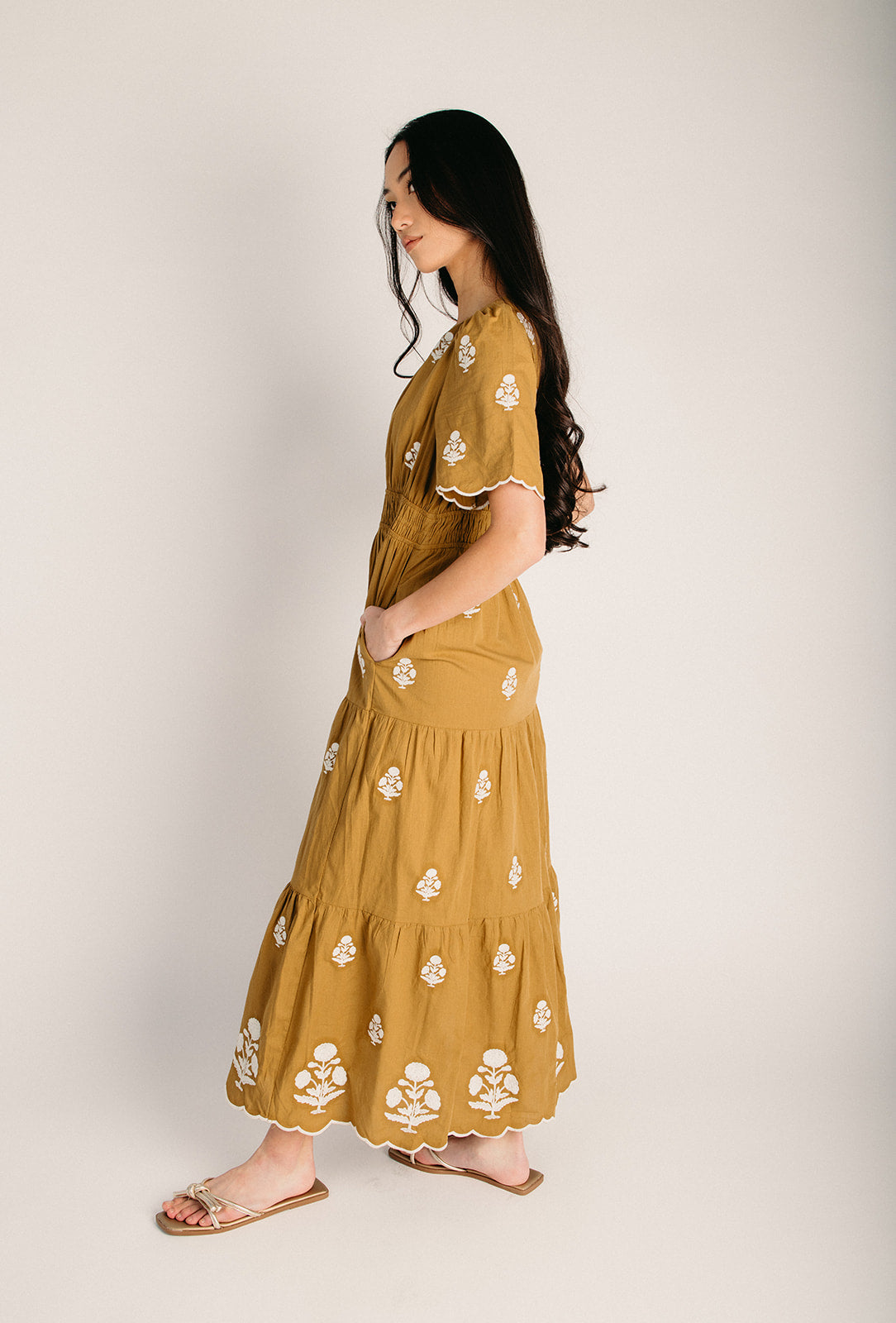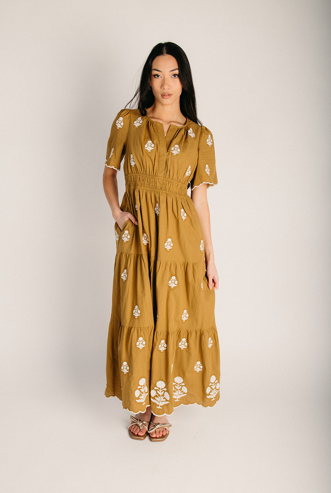The Lundell Embroidered Maxi Dress in Golden Palm