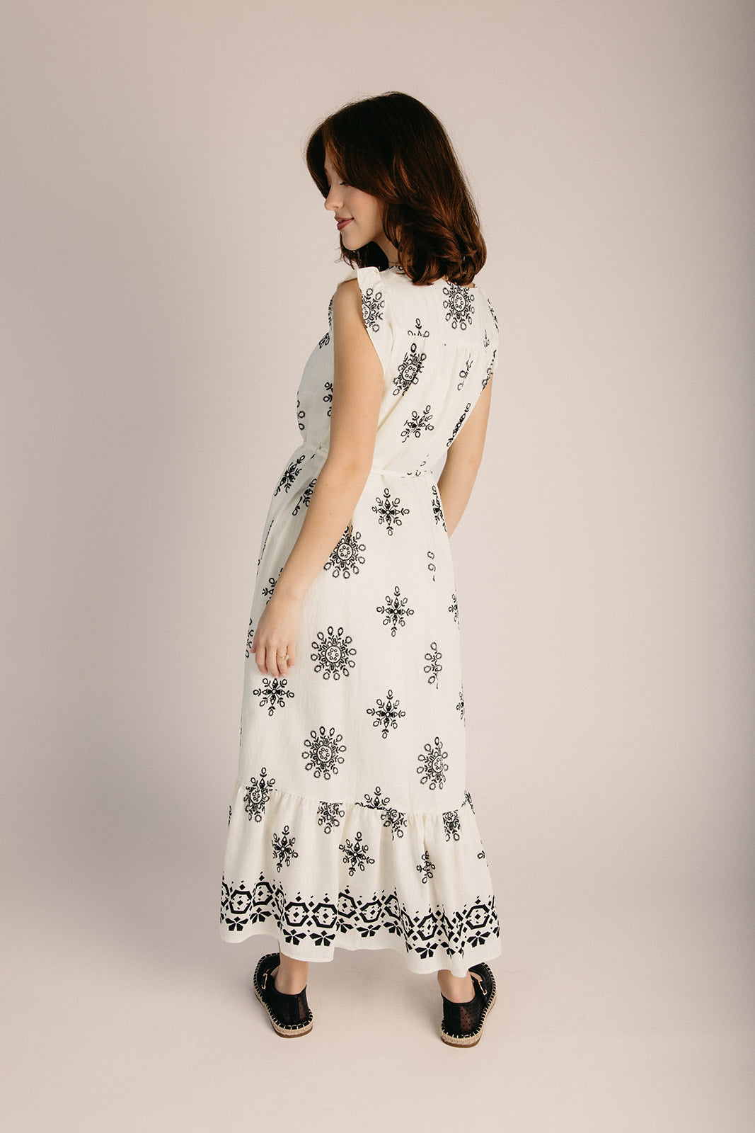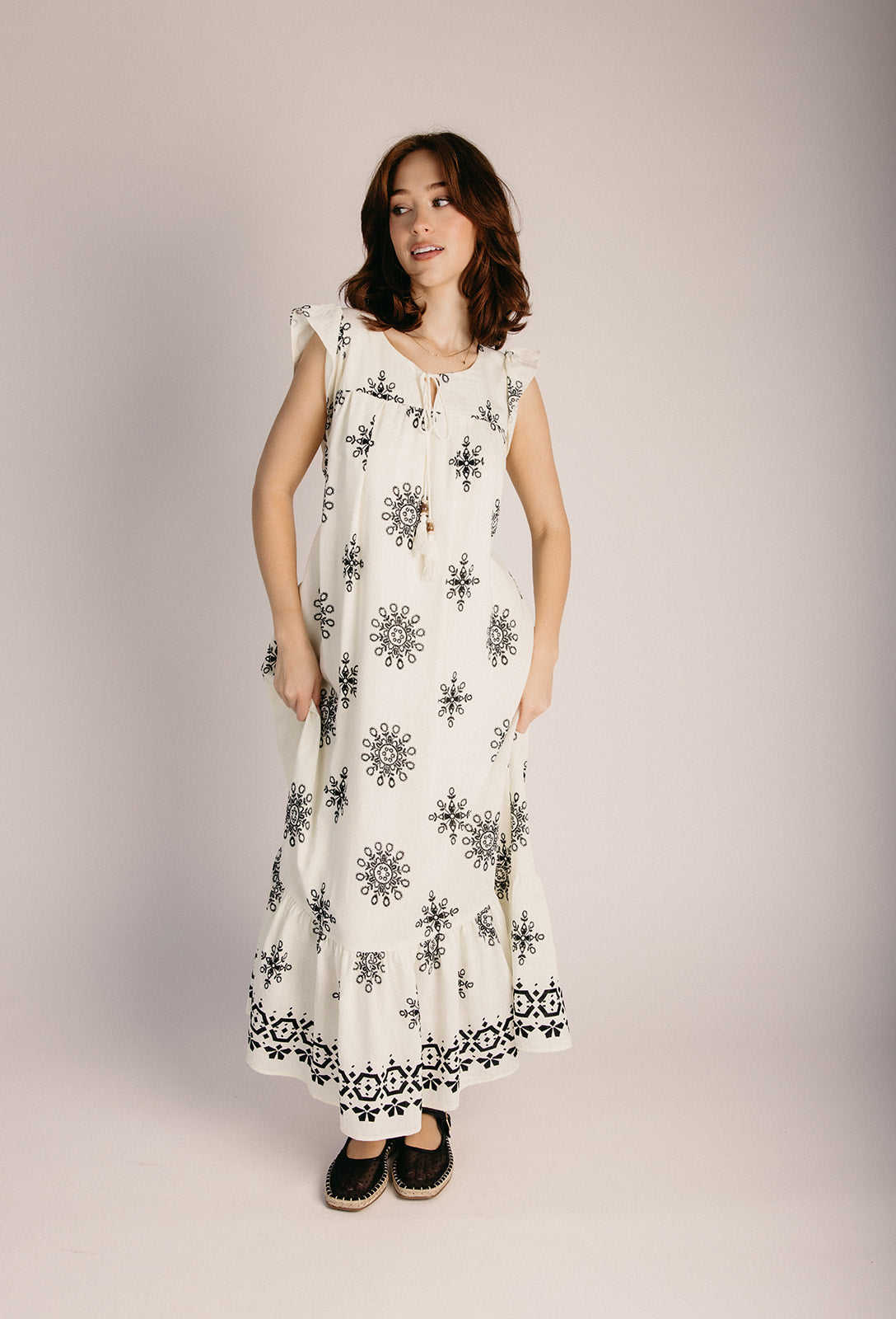Meet the Jerrick Patterned Midi Dress—your new go-to for effortless style! This cream and black beauty features a playful pattern that works from brunch to dinner. It drapes beautifully while offering just the right amount of stretch for all-day comfort. The midi length hits at just the right spot, making it perfect for pairing with sneakers, heels, or sandals. Whether you're dressing it up or keeping it casual, this dress is ready for whatever adventure comes your way.