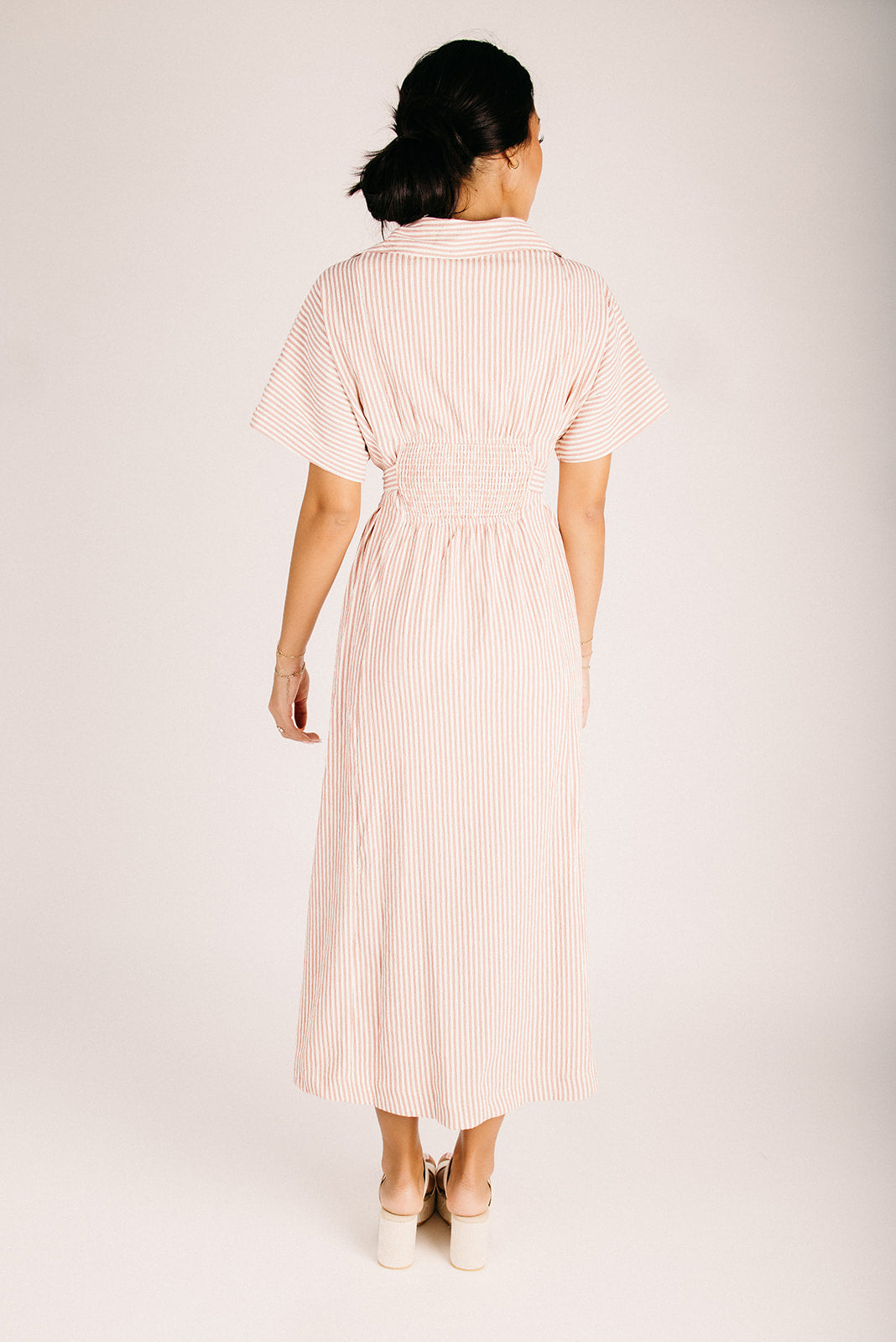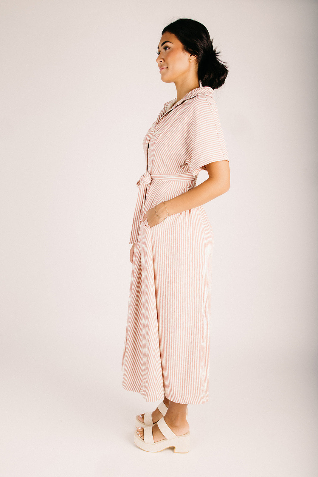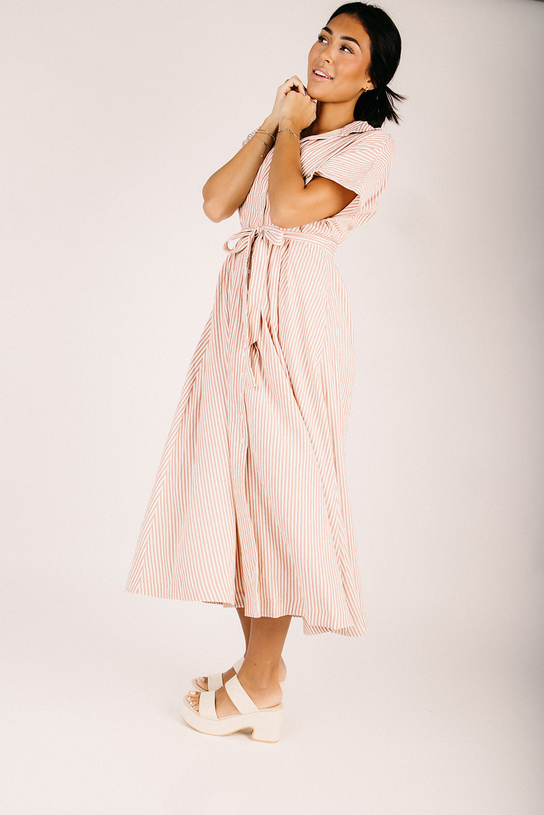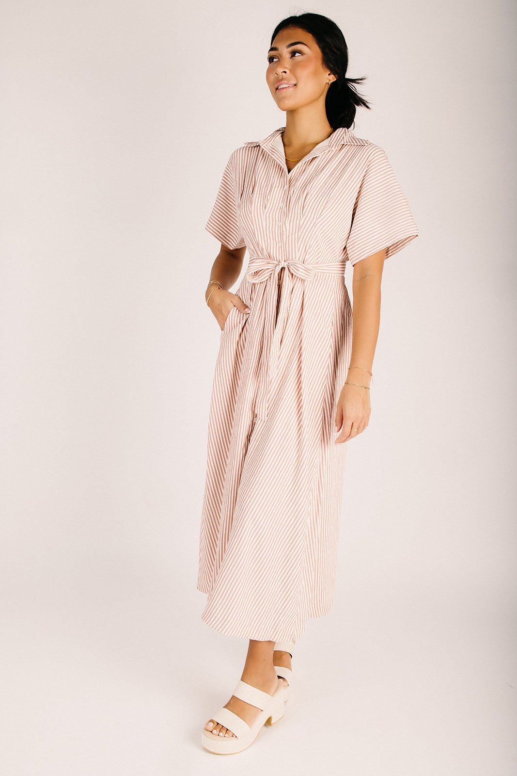 The Nisha Striped Button-Up Midi Dress in Sunset Brick