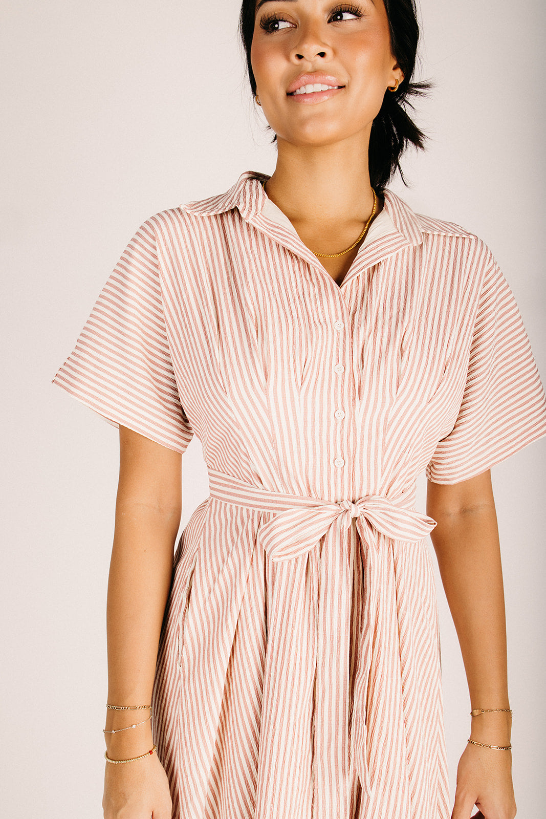 The Nisha Striped Button-Up Midi Dress in Sunset Brick is your new go-to for effortless style. This charming midi features classic vertical stripes in warm sunset brick tones that flatter every figure. The button-up front adds a touch of vintage-inspired appeal, while the relaxed fit keeps things comfortable all day long. Perfect for casual outings, weekend brunches, or dressing up with your favorite accessories. A versatile wardrobe essential that proves stripes never go out of style.