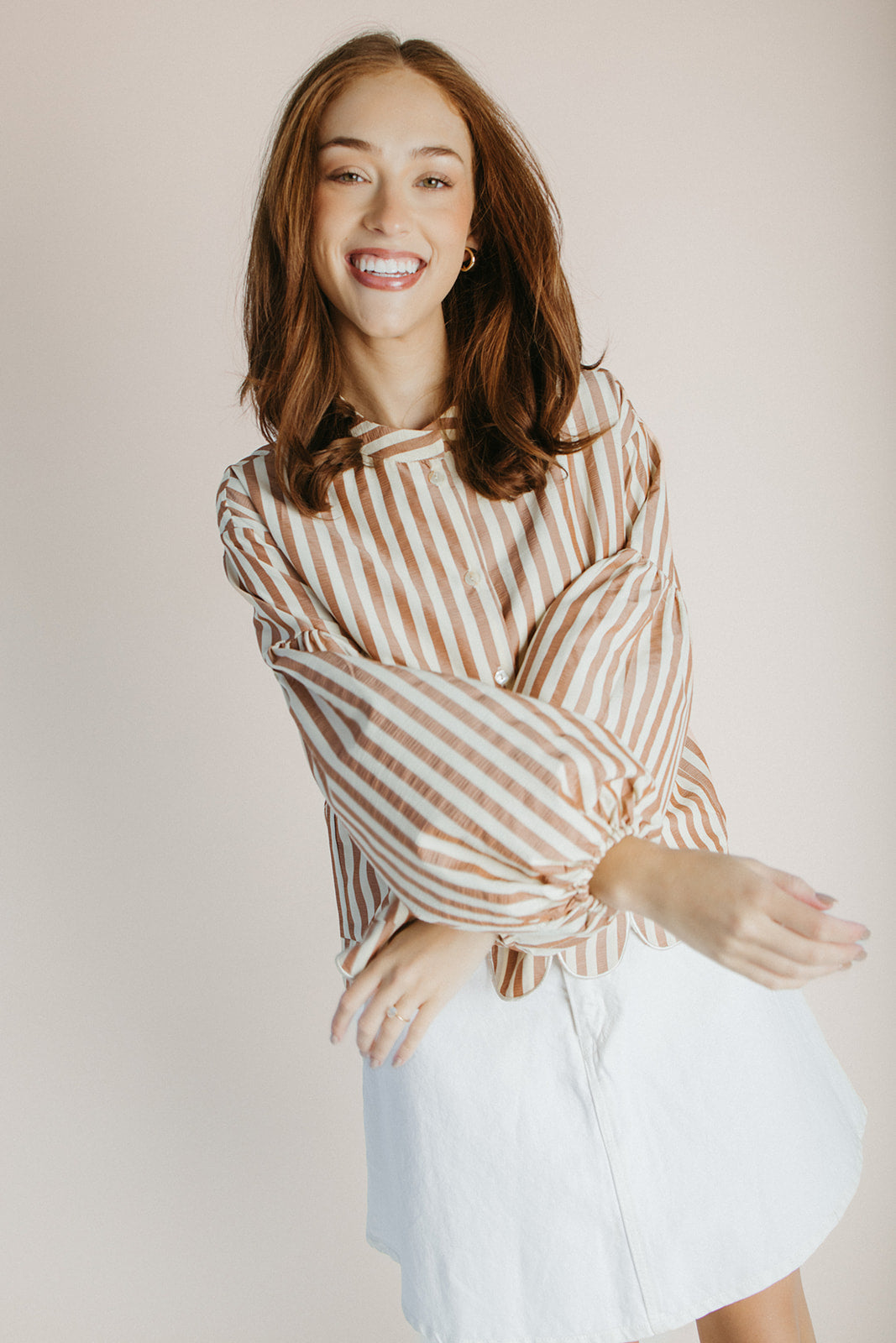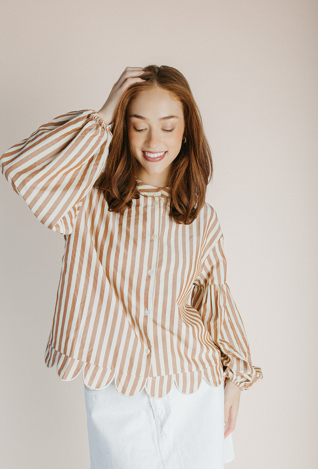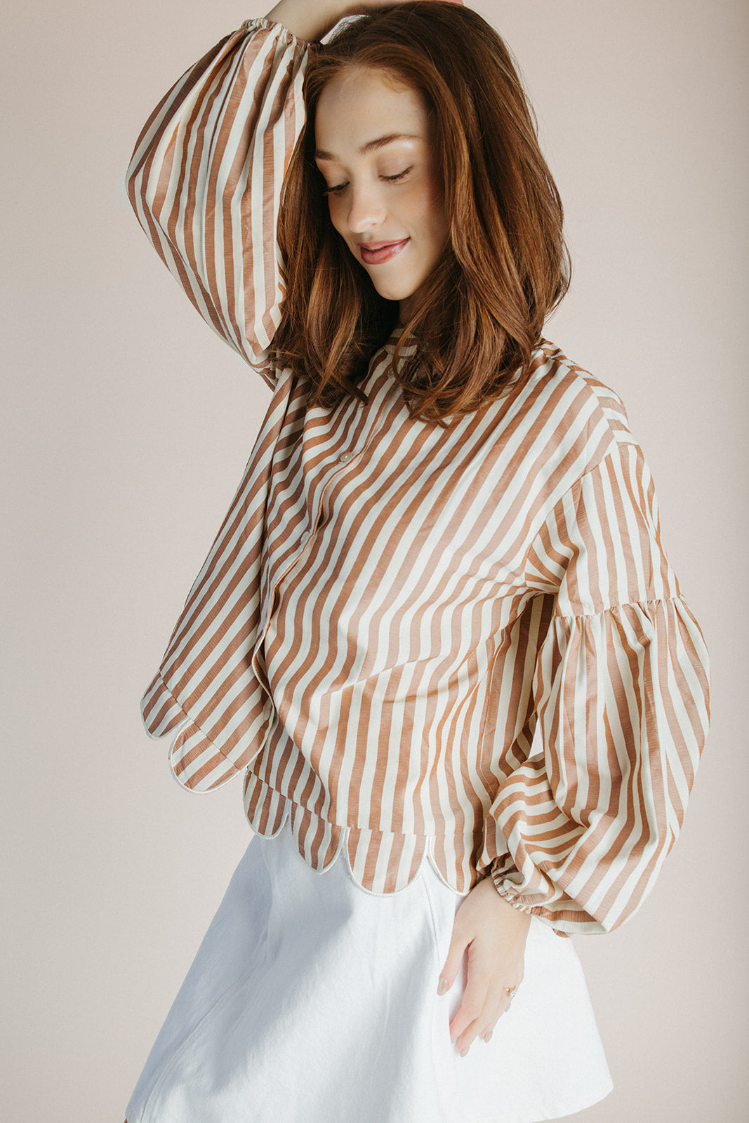 The Beatrice Striped Button-Up Blouse in Camel