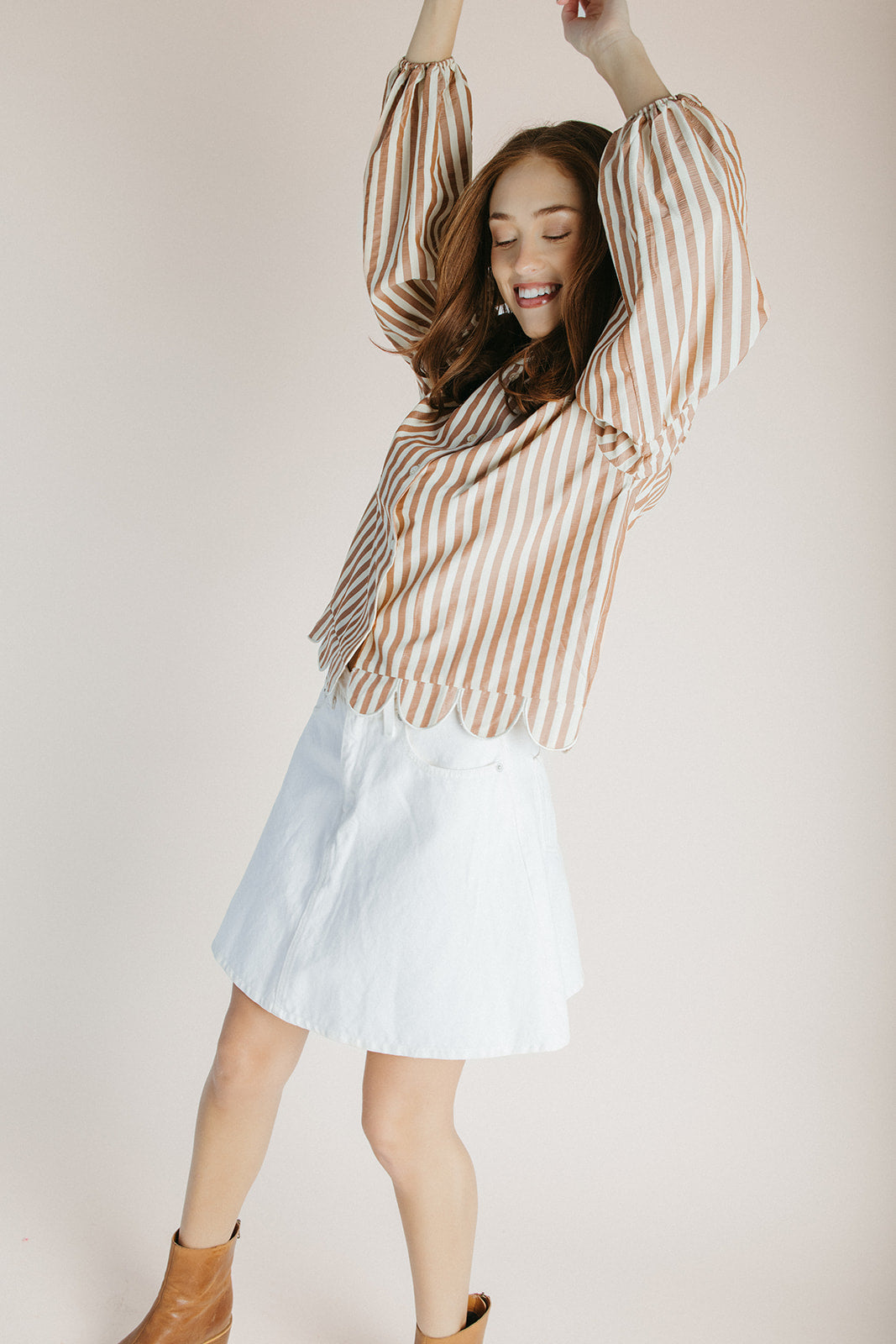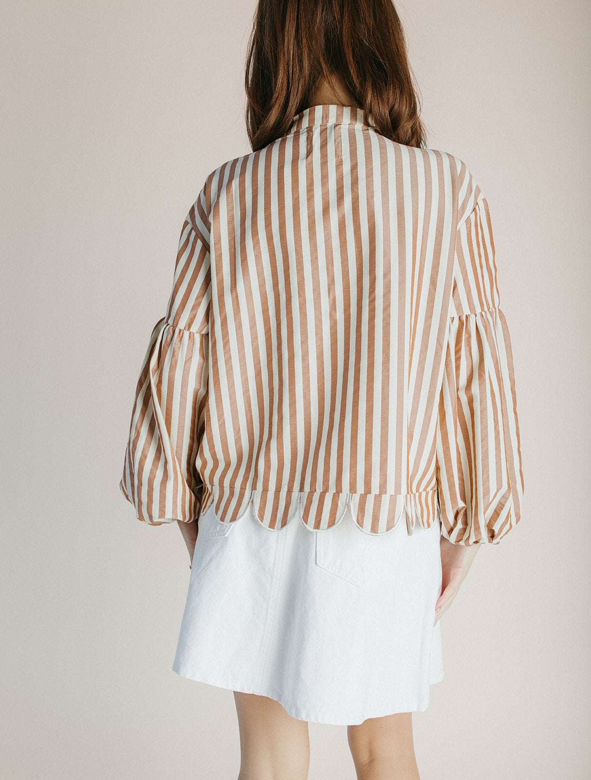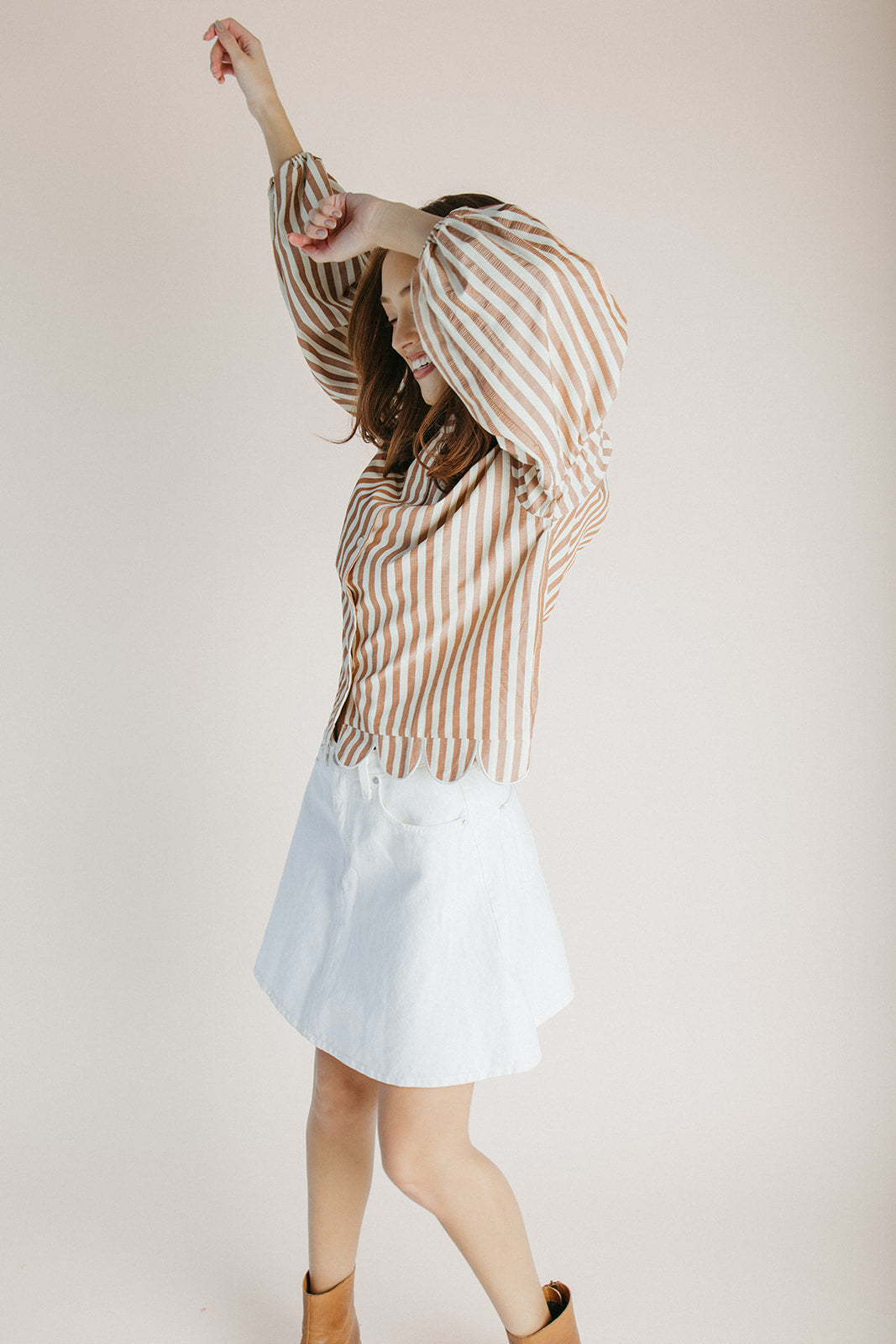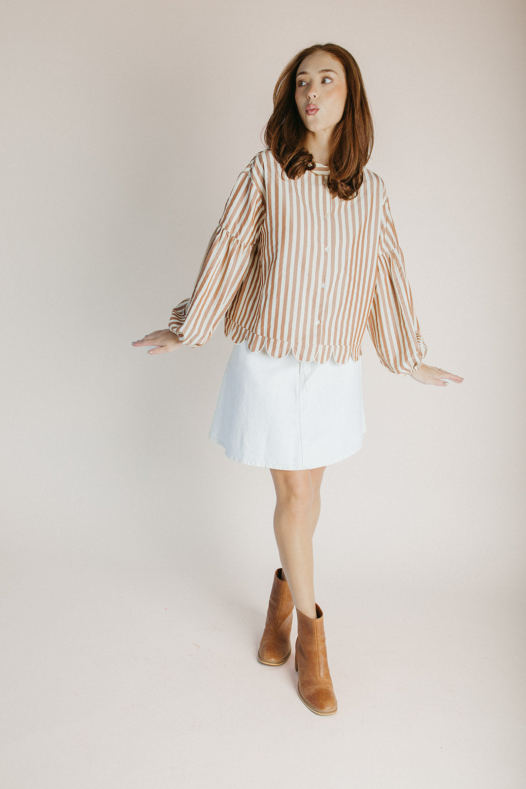 The Beatrice Striped Button-Up Blouse in Camel