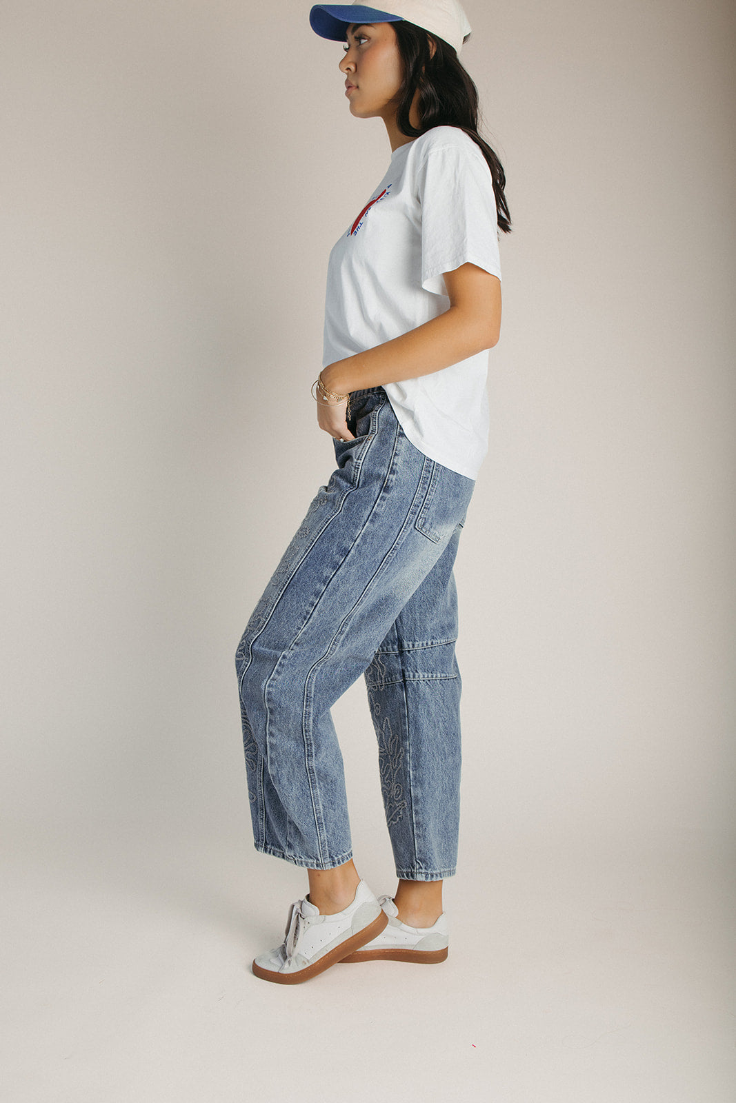 The Brianna Embroidered Barrel Jean in Medium Wash