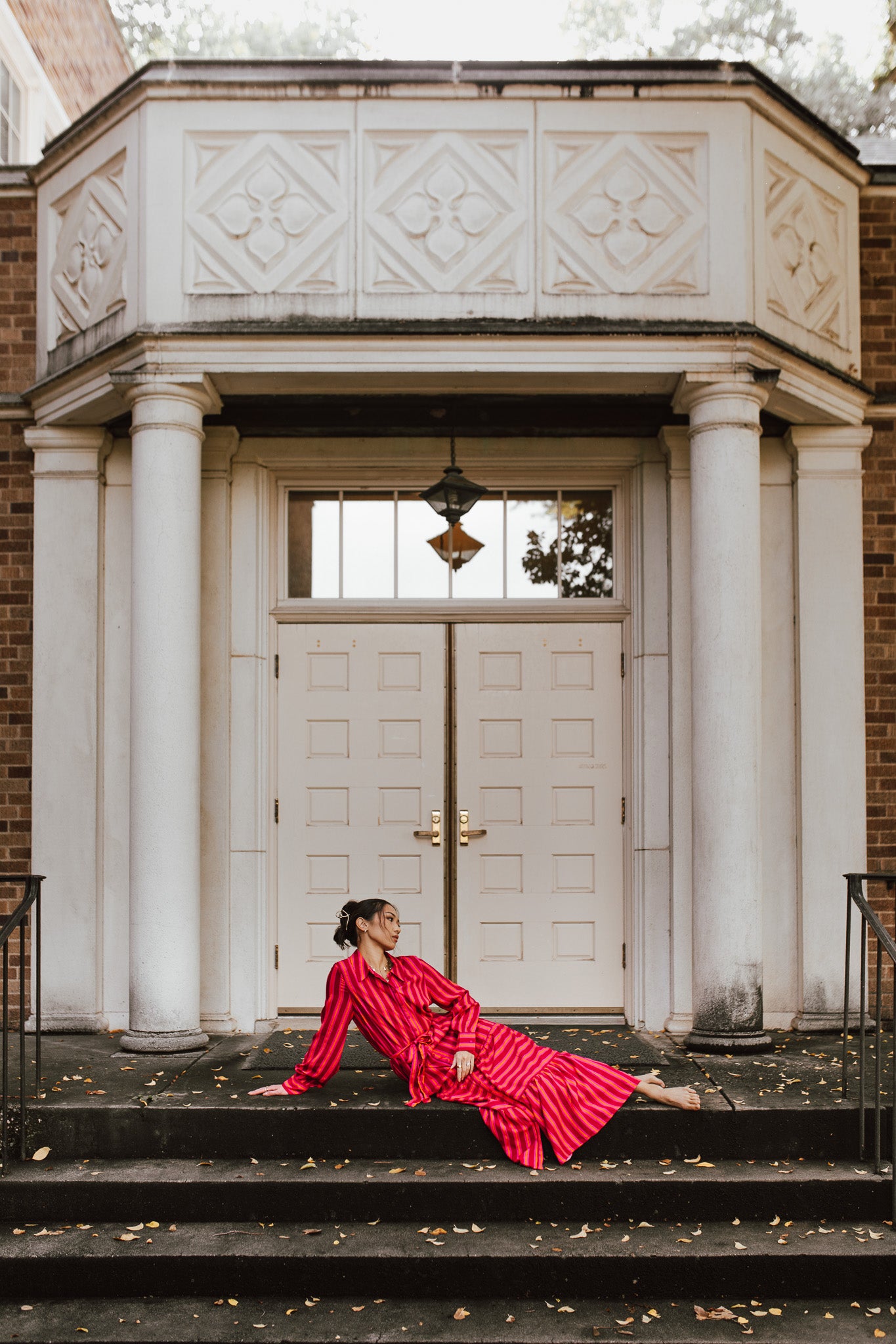 The Clarisa Striped Button-Up Maxi Dress in Fuchsia + Orange