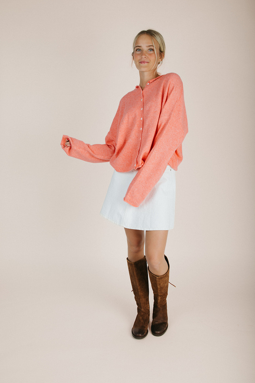 Classic + cute. This cardigan has delicate buttons down the front. It can be worn as a blouse or layered. It is a versatile neutral color with a cropped length.