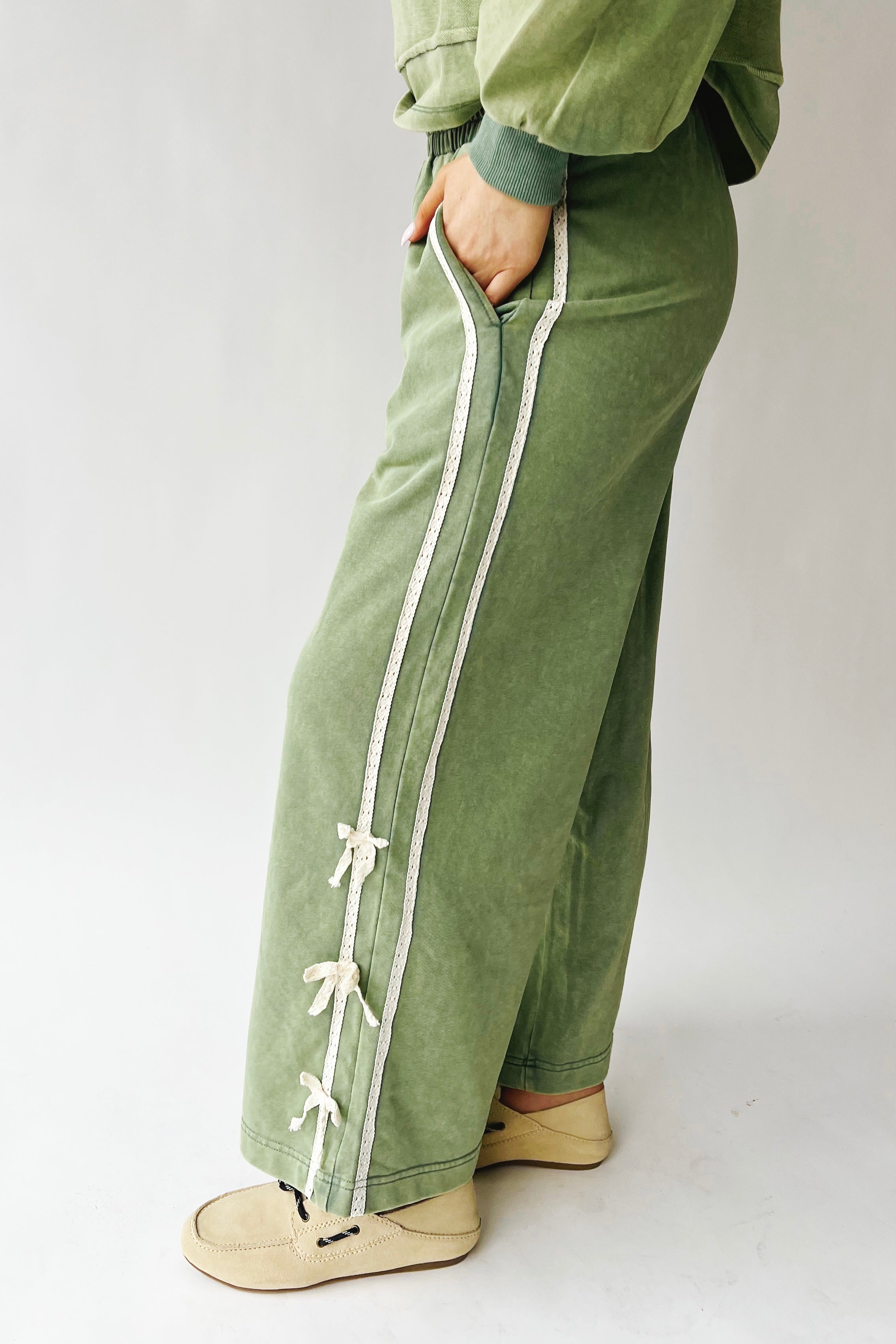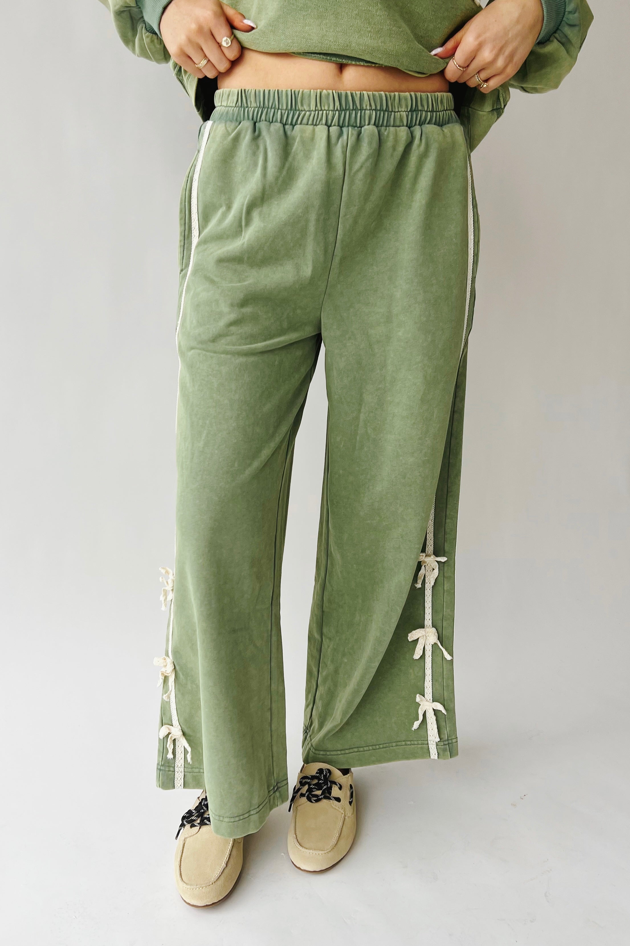 The Worlow Lace Bow Detail Pant in Matcha is your new go-to for effortless style with a touch of whimsy. Crafted in a soothing matcha hue, these pants feature delicate lace bow details that add personality without trying too hard. Perfect for elevating your everyday look or dressing up for a night out, they strike that sweet spot between comfortable and chic. Whether you're running errands or heading to brunch, these pants bring a playful edge to any outfit while keeping you feeling confident and fabulous. Pairs perfectly with The Swanson Lace Bow Detail Pullover in Matcha!