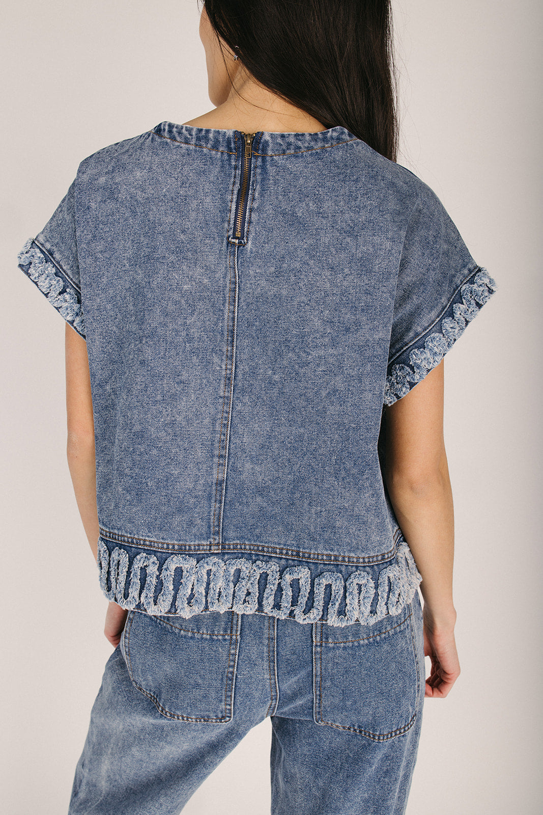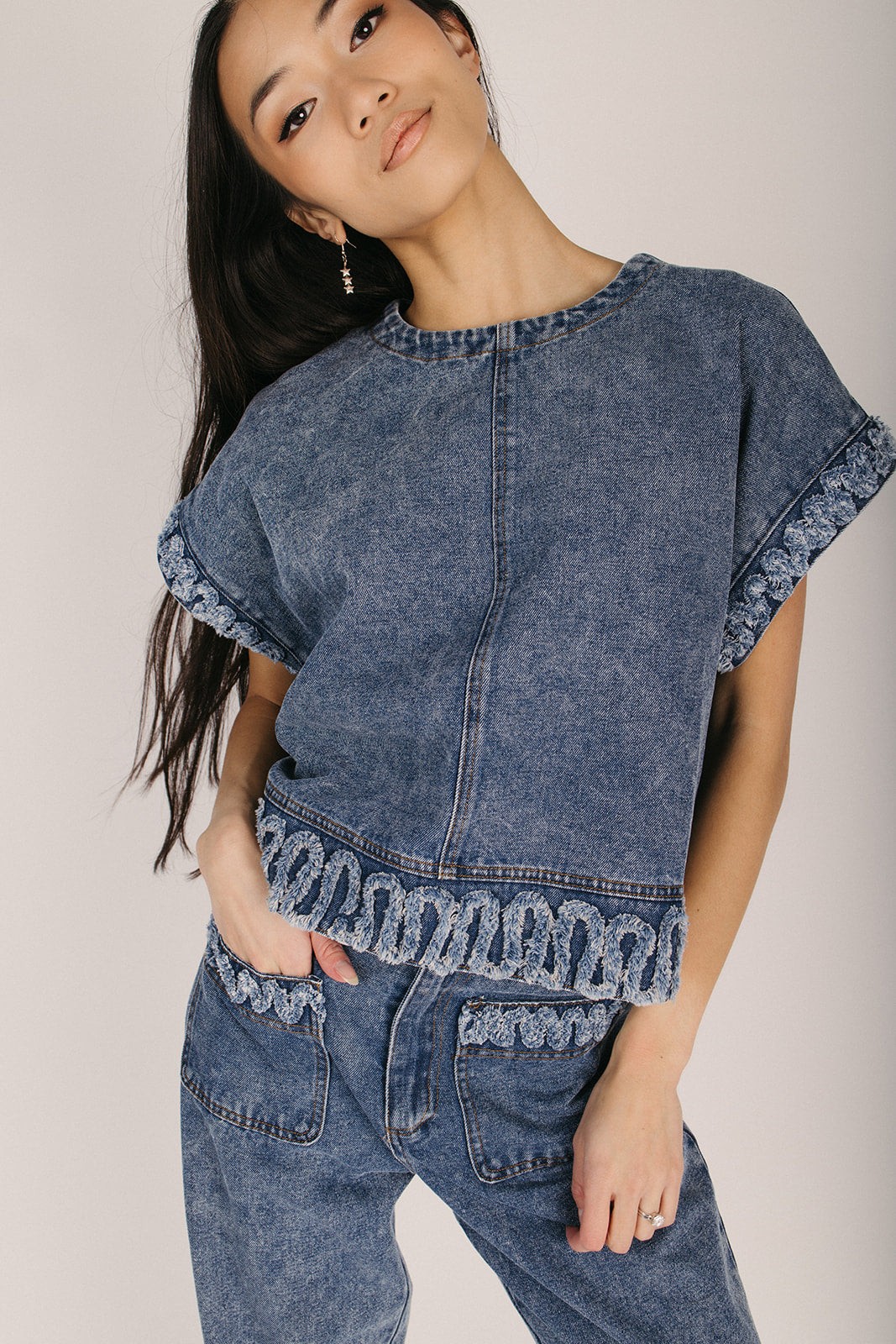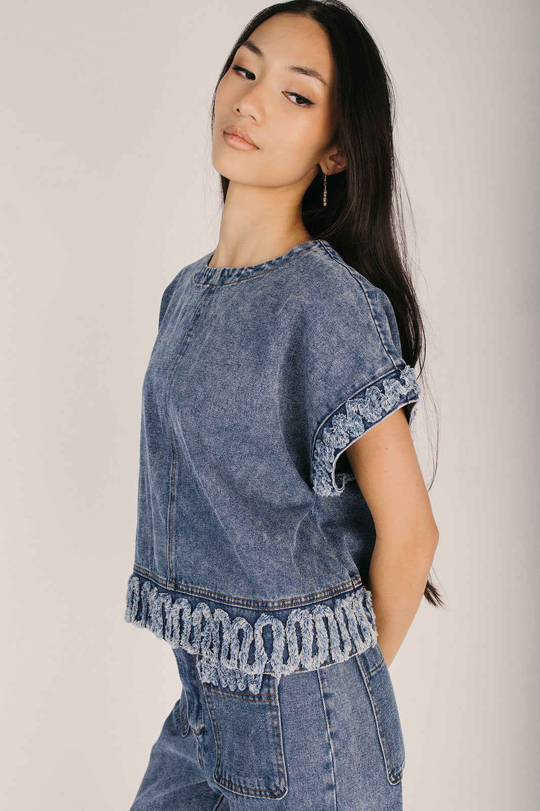 Introducing the Byram Fringe Detail Blouse in Denim – your new go-to for effortless cool. This classic denim blouse gets a fun twist with playful fringe detailing that adds movement and personality to every outfit. Perfect for dressing up or down, it's the kind of piece that works as hard as you do while keeping things light and breezy. Throw it on over a tee, tie it at the waist, or wear it solo – the Byram adapts to your vibe. Denim never felt this good.