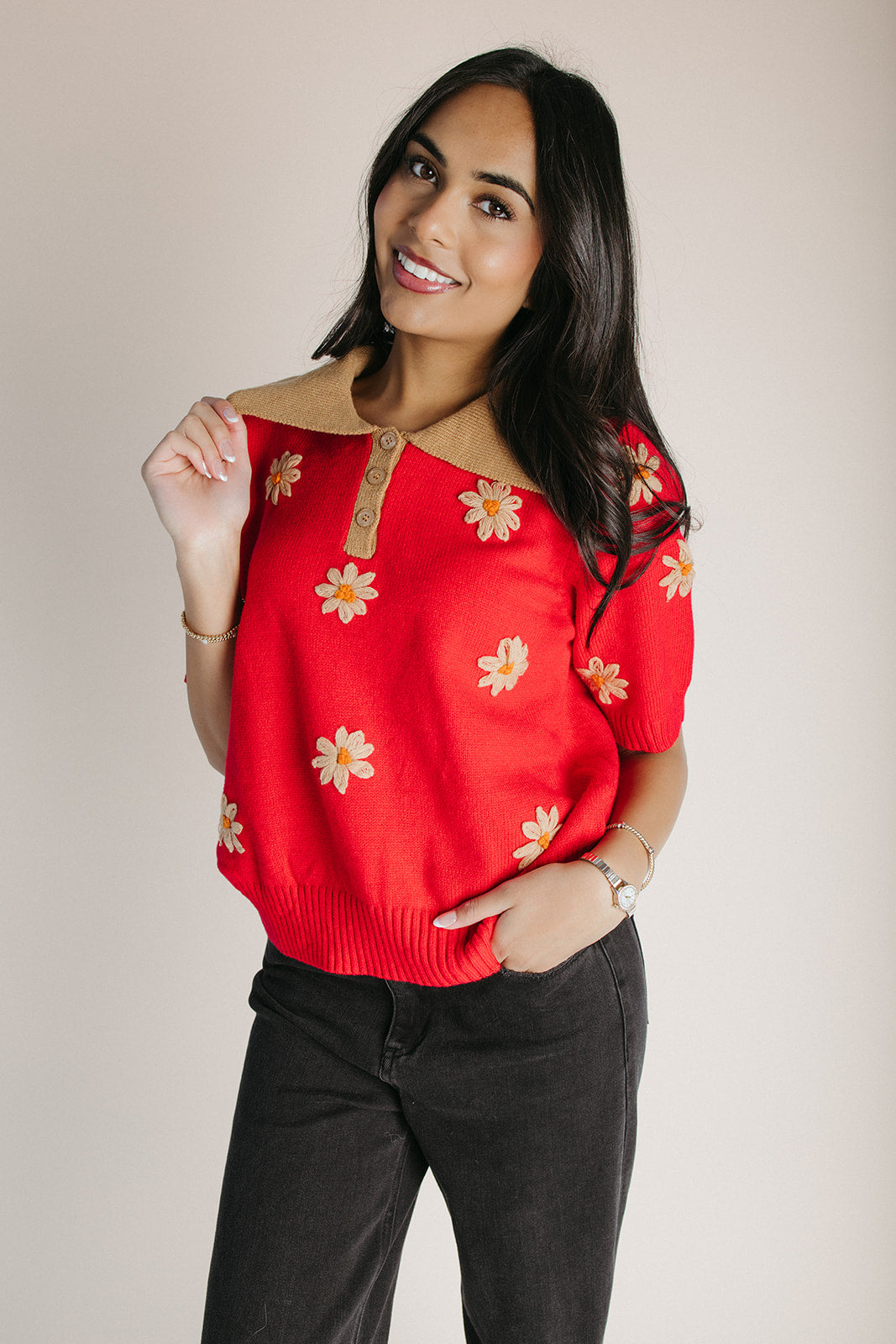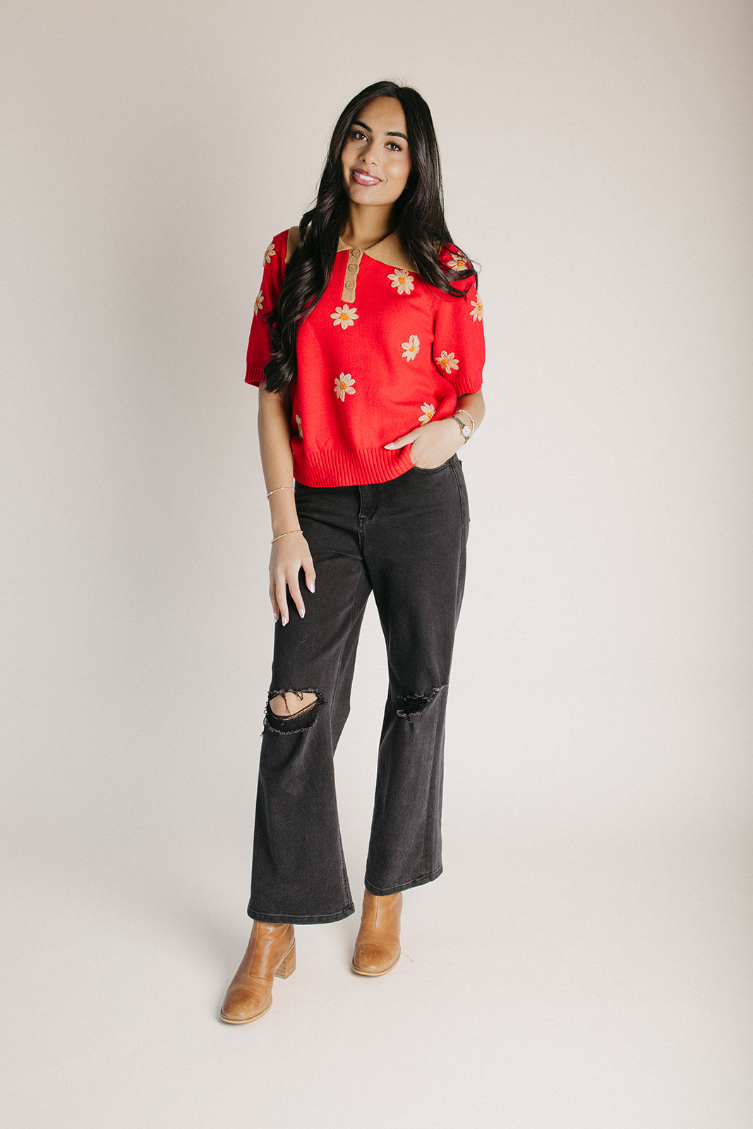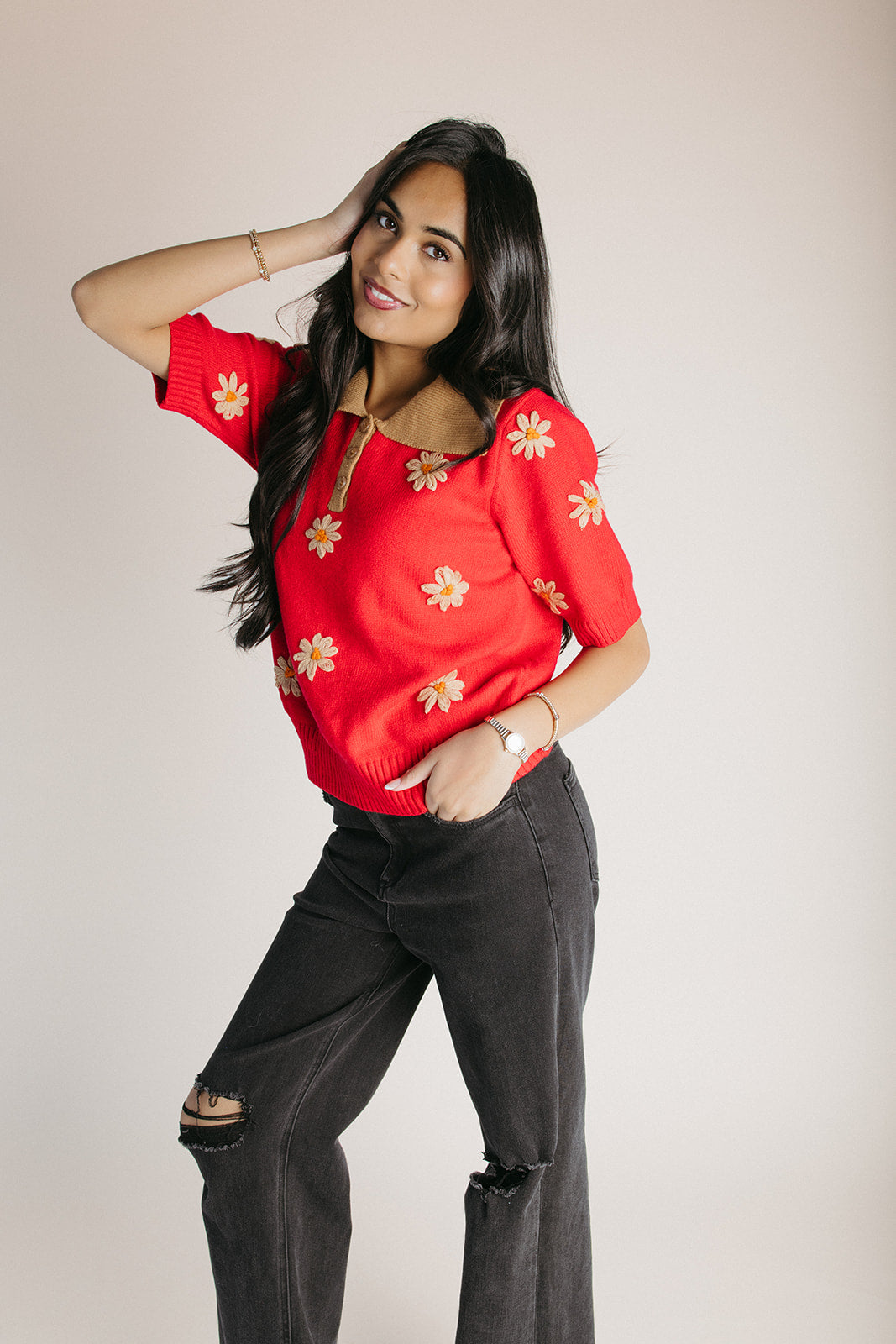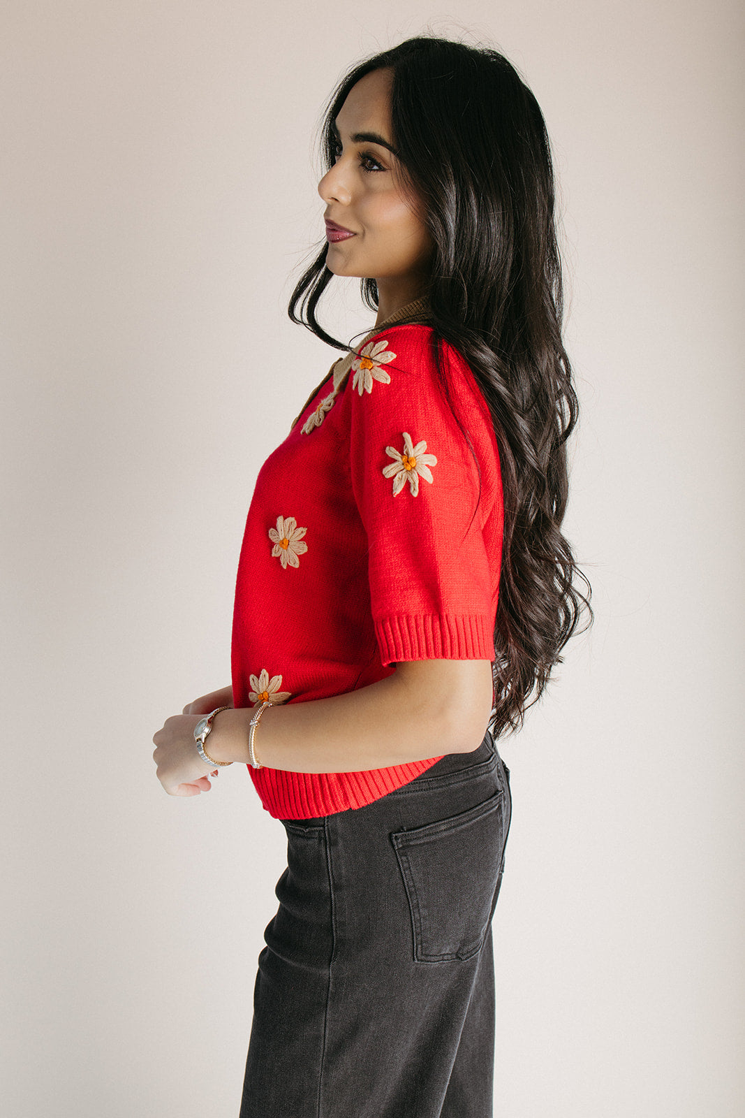 The Swayne Stitched Floral Sweater in Red is your new go-to for effortless charm. Featuring delicate floral stitching that adds personality to any outfit, this cozy red sweater brings warmth and whimsy to your wardrobe. Perfect for layering on crisp days or wearing solo when you want to make a statement. Whether you're heading to brunch or cozying up at home, this sweater strikes the perfect balance between playful and polished. A timeless piece that proves florals aren't just for spring.