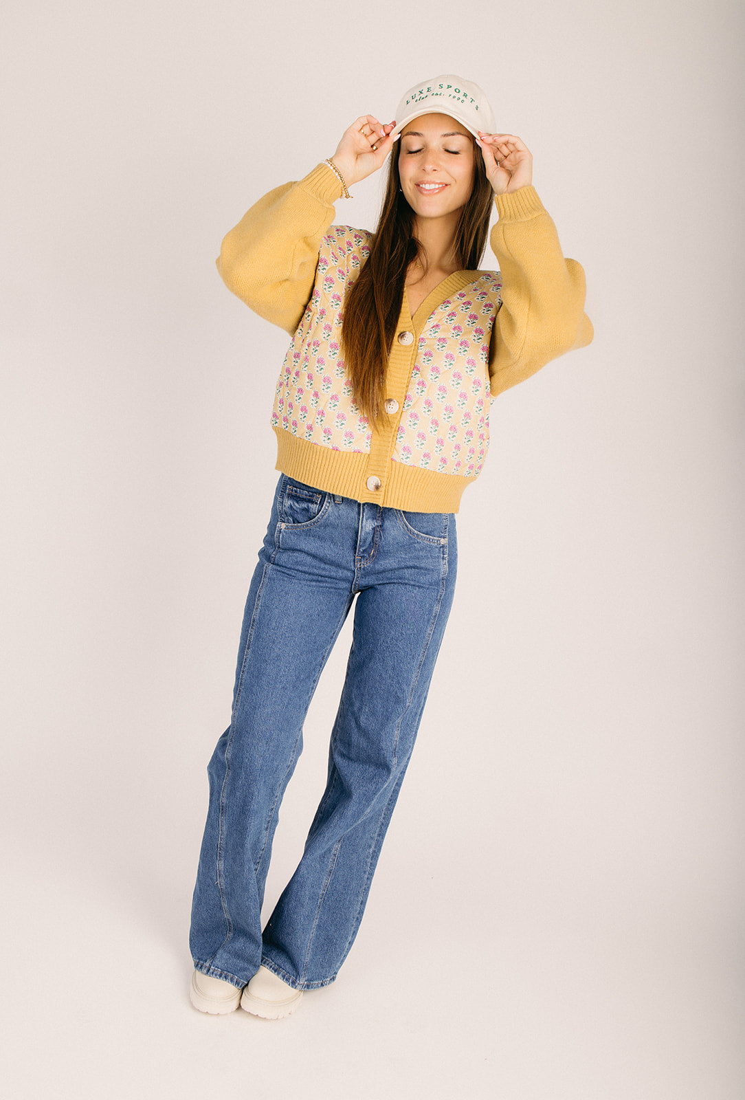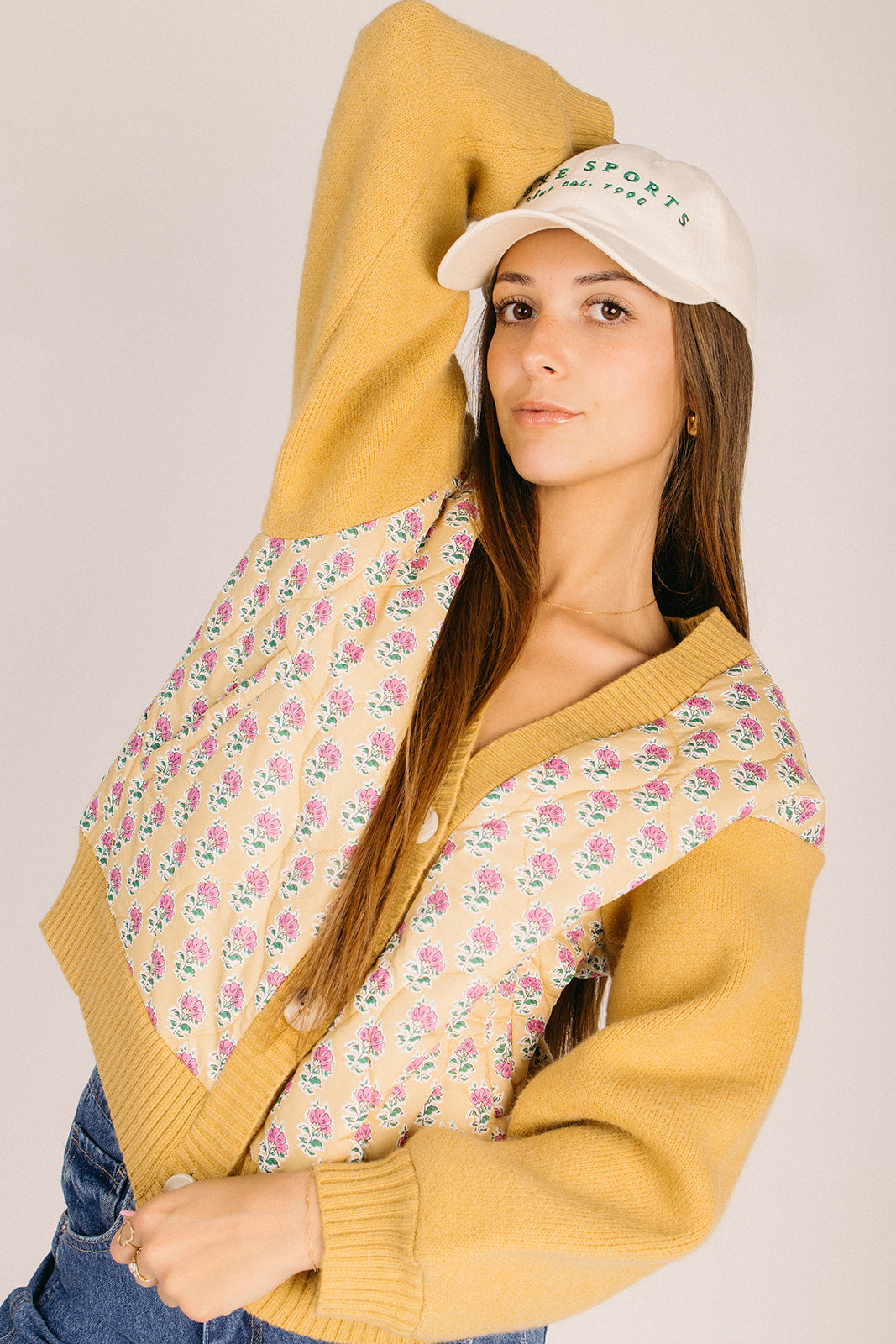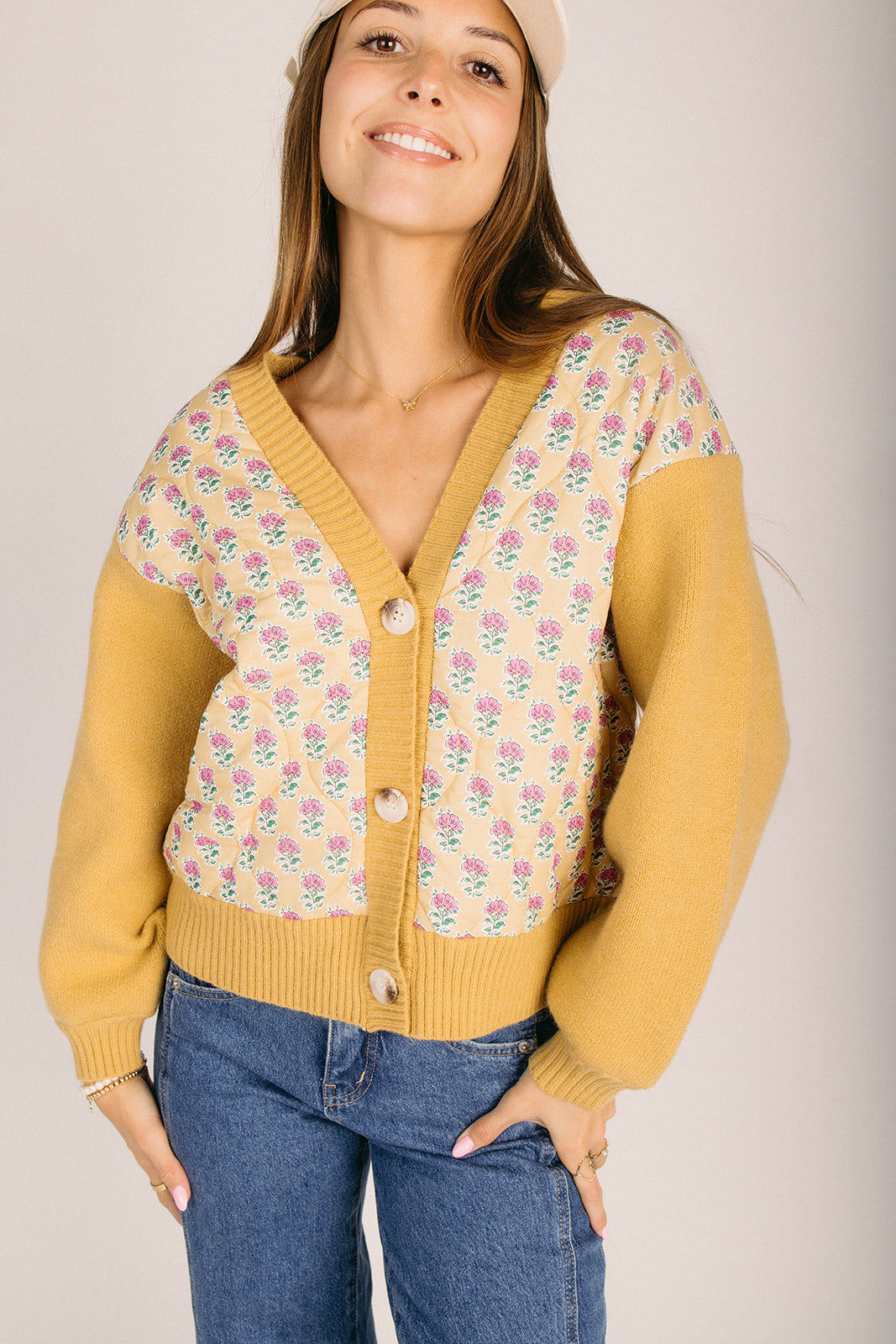 Brighten your wardrobe with this charming button-up cardigan featuring a delightful floral print in warm mustard and soft pink tones. Perfect for layering over your favorite tees or dresses, this piece brings effortless style and a pop of color to any outfit. The classic cardigan silhouette pairs beautifully with everything from casual jeans to polished trousers, making it a versatile staple you'll reach for again and again. Slip it on for an instant mood boost!