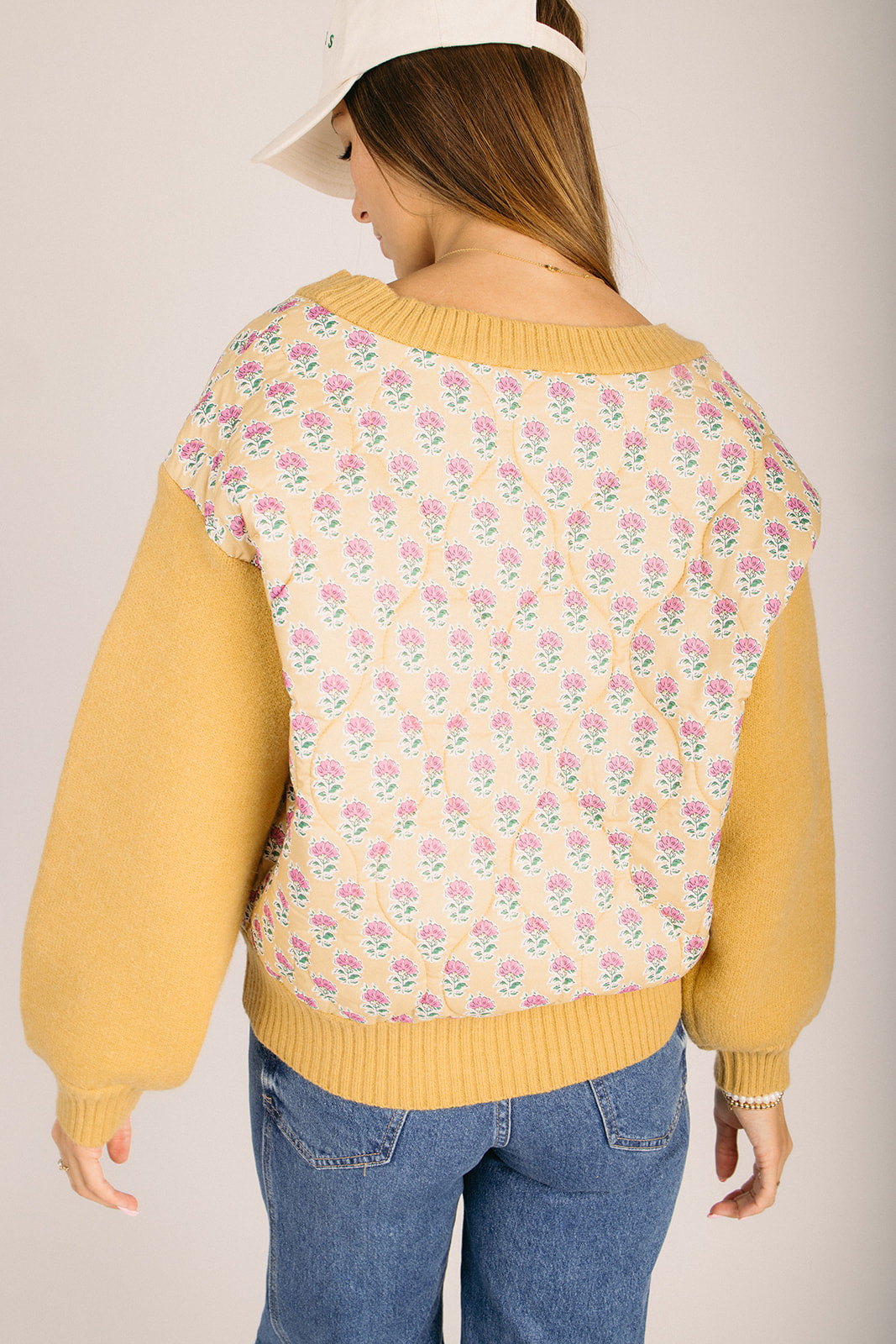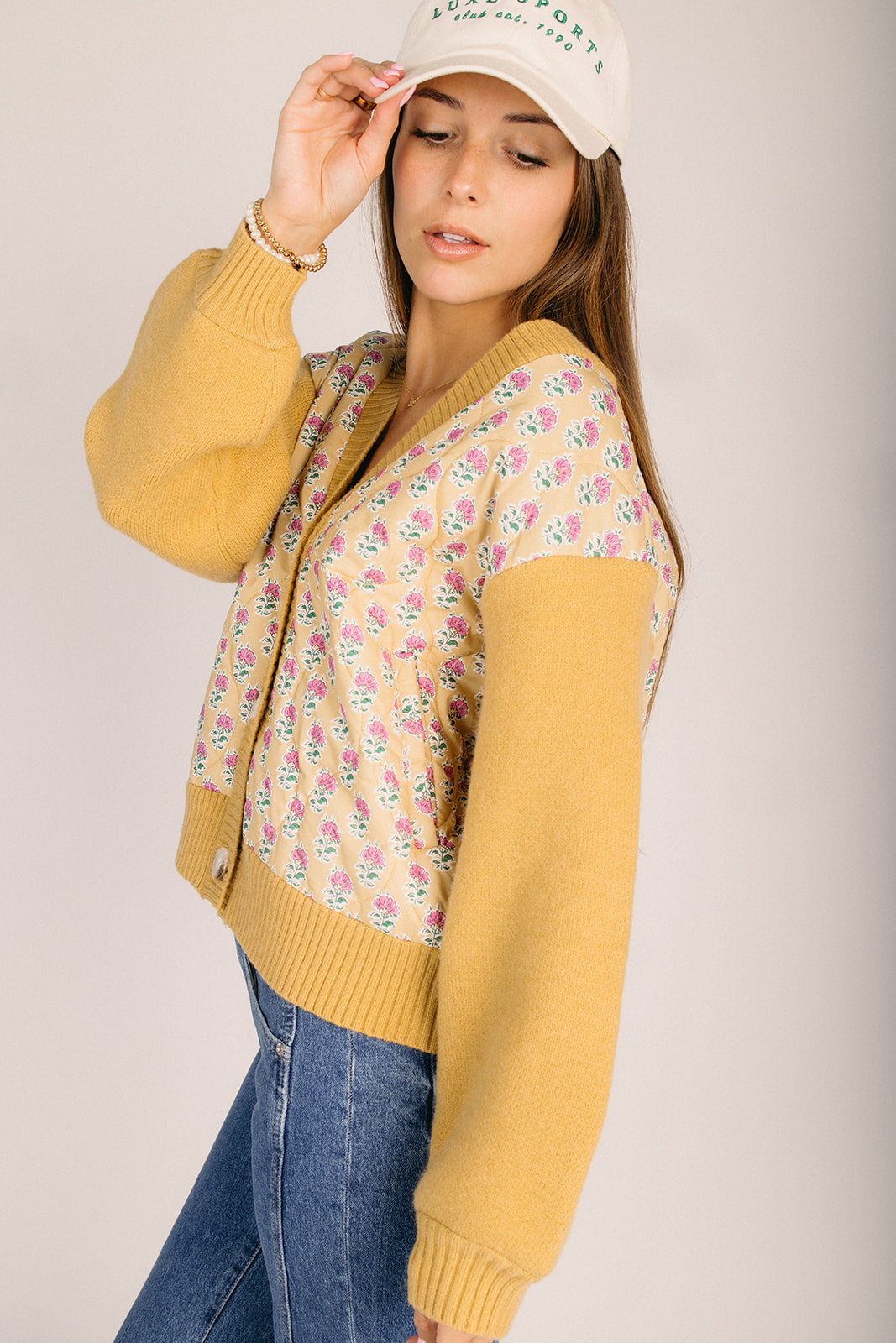 The Juneal Floral Button-Up Cardigan in Mustard + Pink