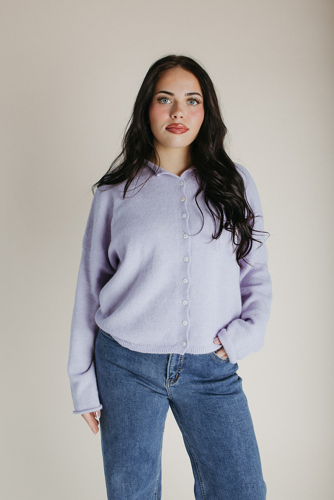 Classic + cute. This cardigan has delicate buttons down the front. It can be worn as a blouse or layered. It is a versatile neutral color with a cropped length.