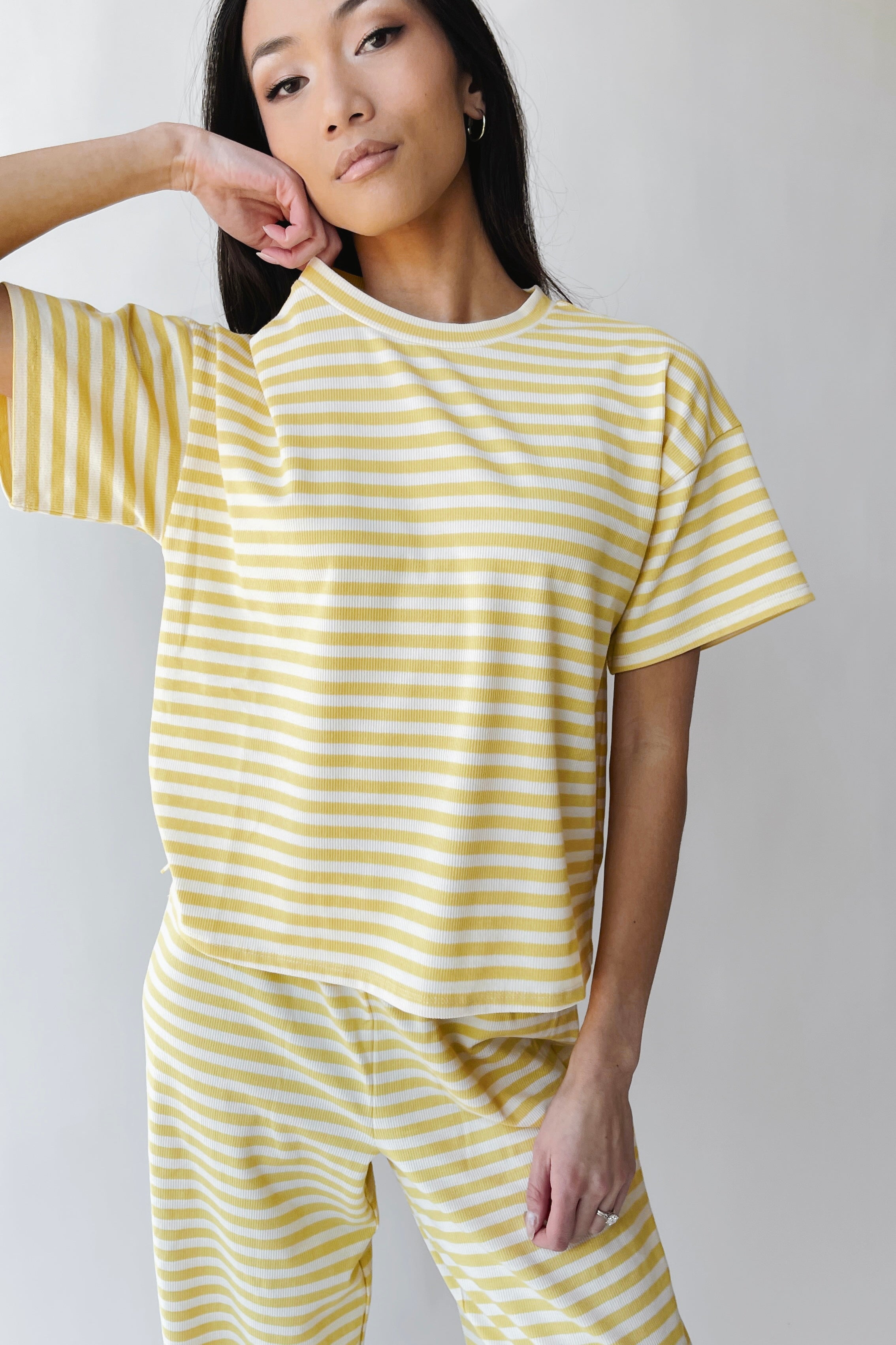 The Timothee Striped Lounge Tee in Butter is your new favorite excuse to stay cozy. Soft, breathable fabric keeps you comfortable whether you're lounging at home or running errands around town. The classic striped pattern adds just enough visual interest to make you feel put-together, even when you're definitely not trying. Perfect for layering or wearing solo, this butter-hued tee is basically a hug you can wear. Pairs perfectly with The Chalamet Striped Lounge Pant in Butter!