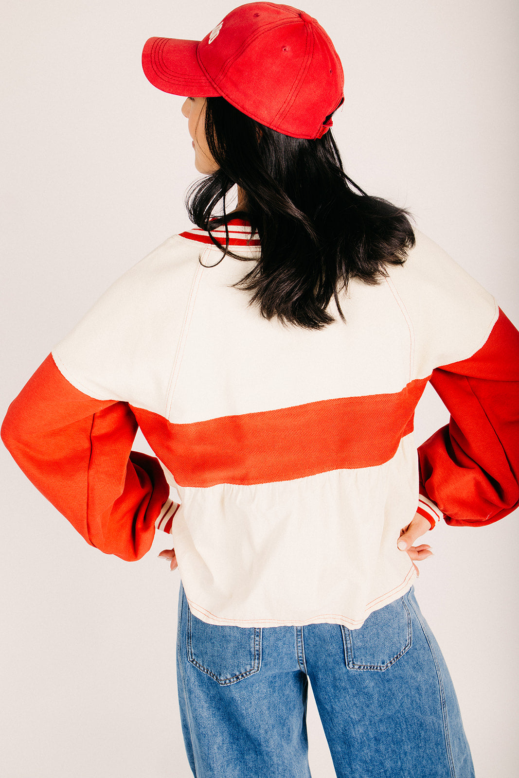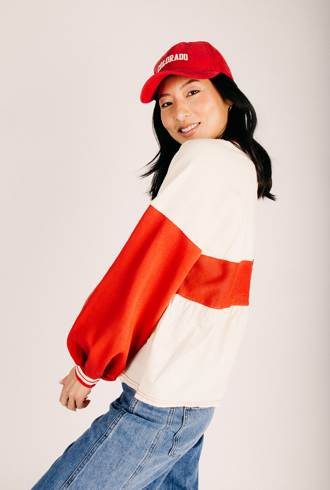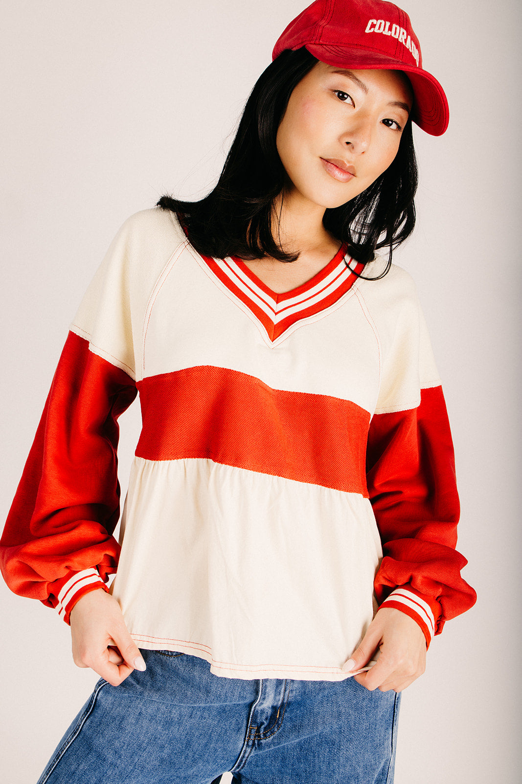 The Wenstrom Colorblock Babydoll Blouse in Cream + Rust