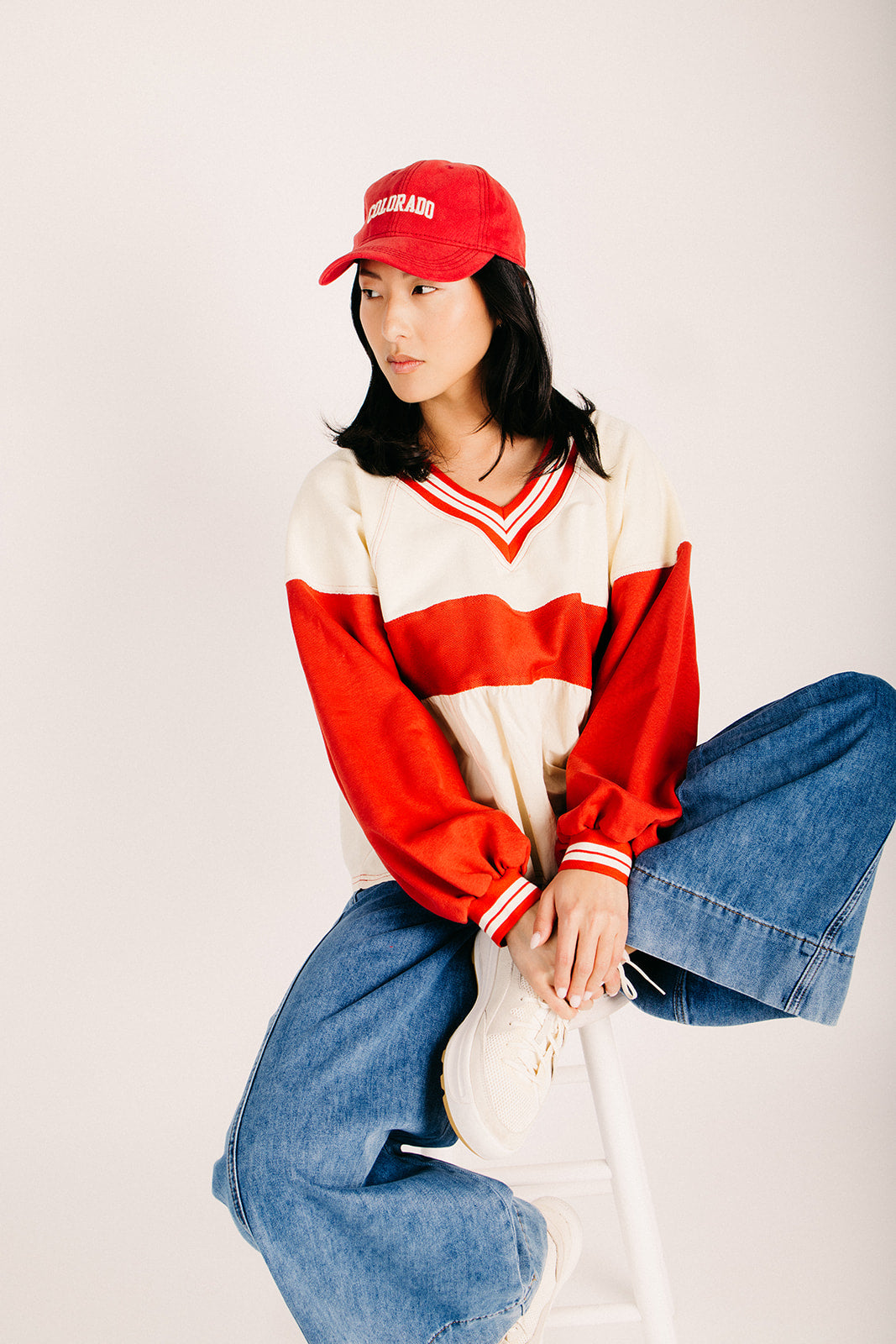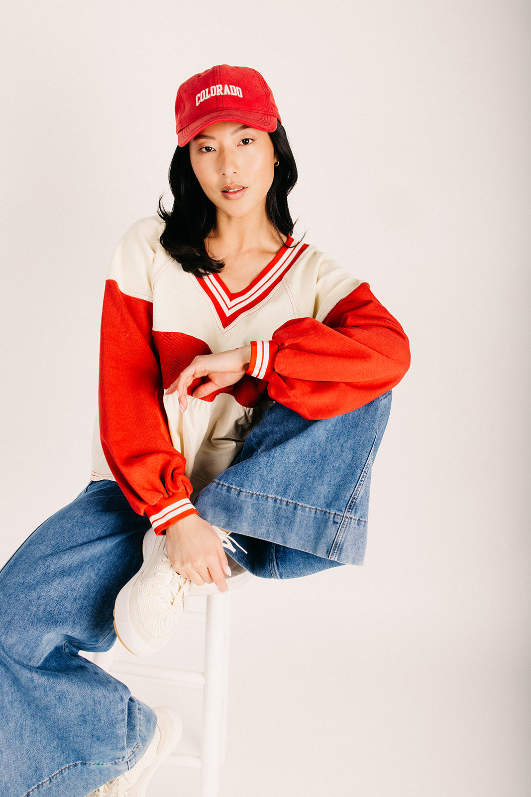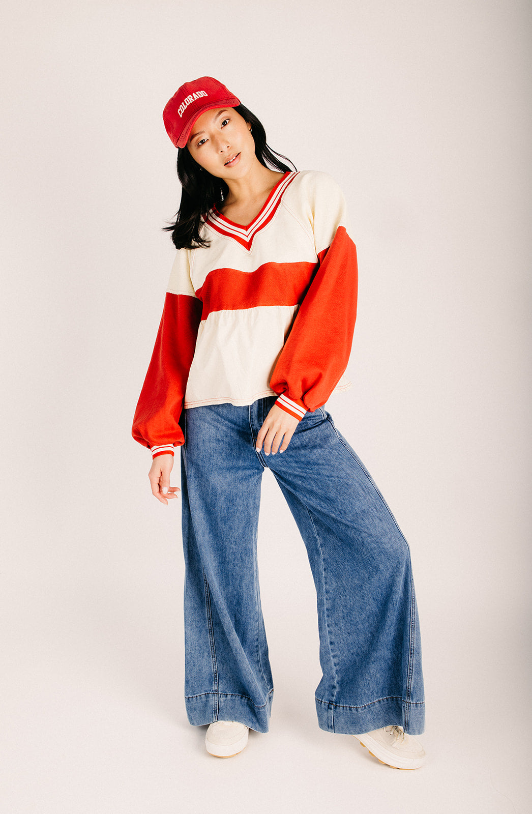 The Wenstrom Colorblock Babydoll Blouse in Cream + Rust