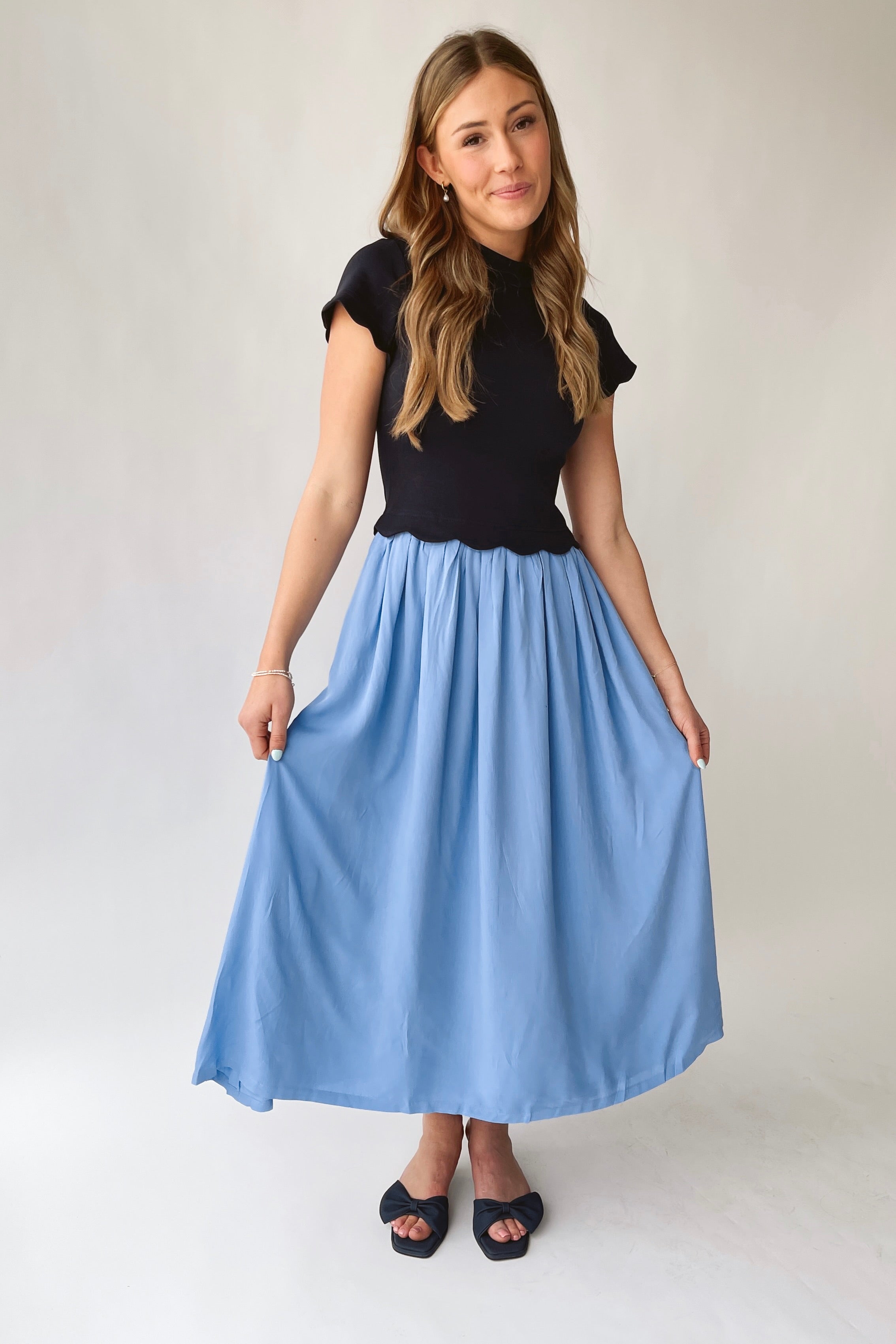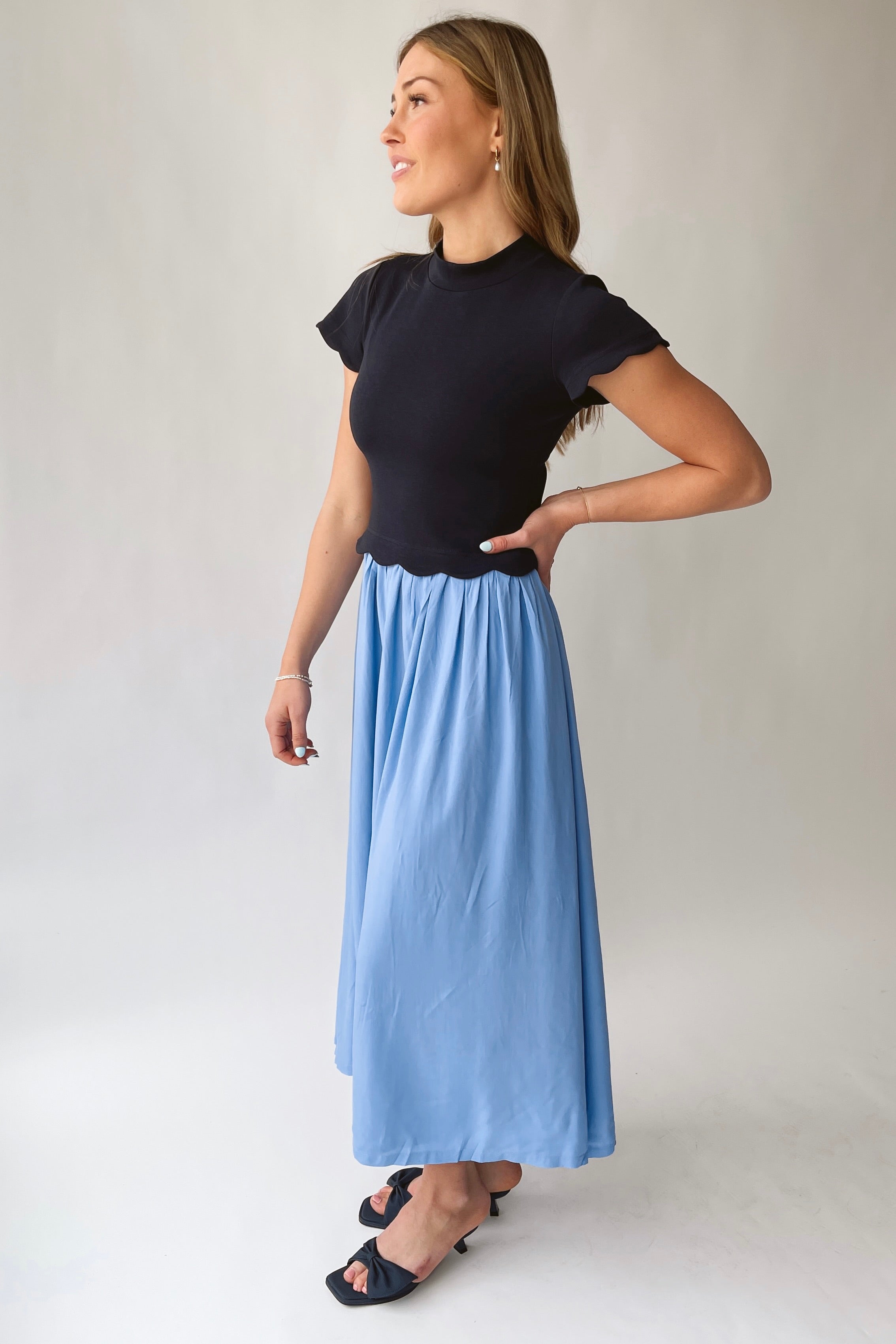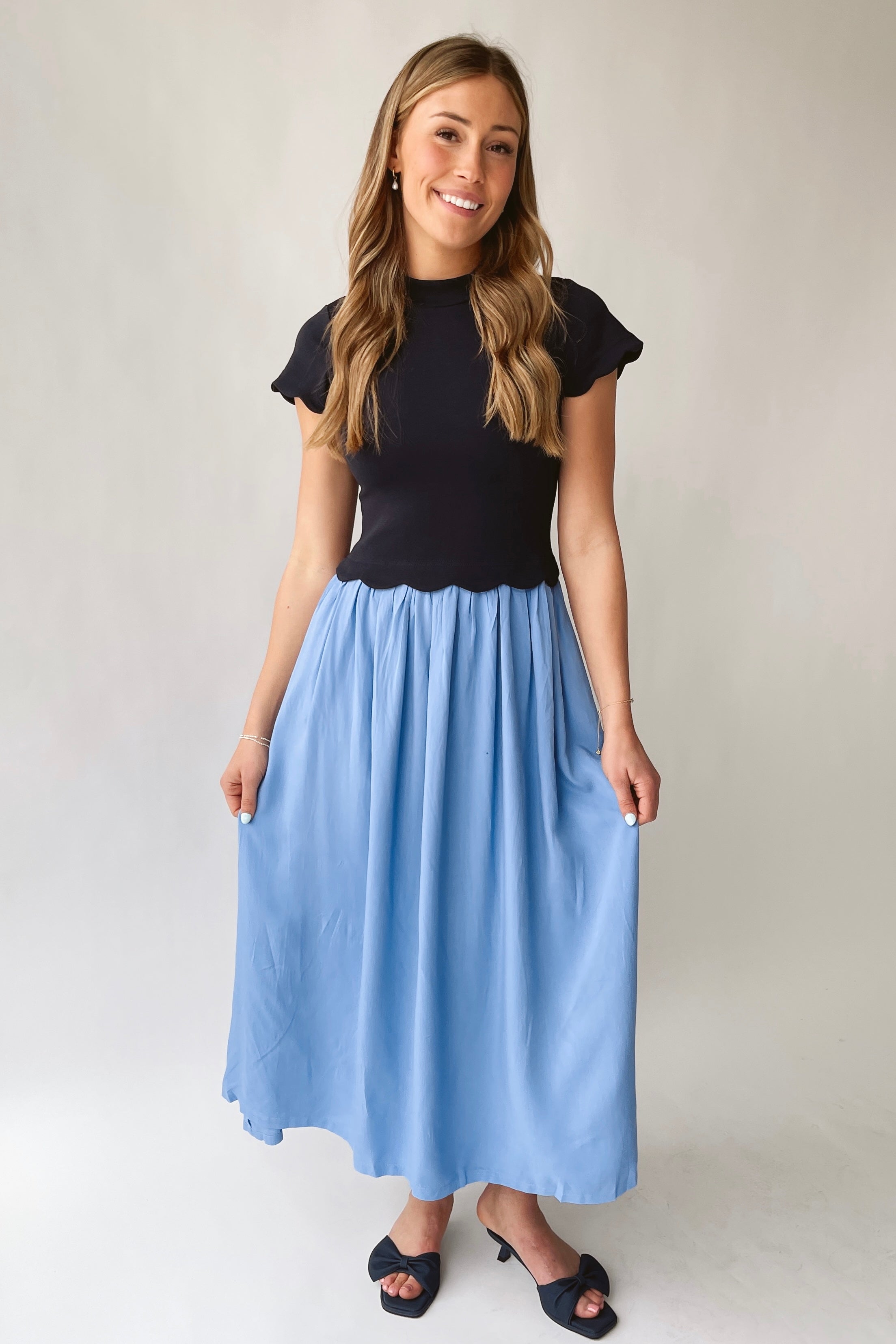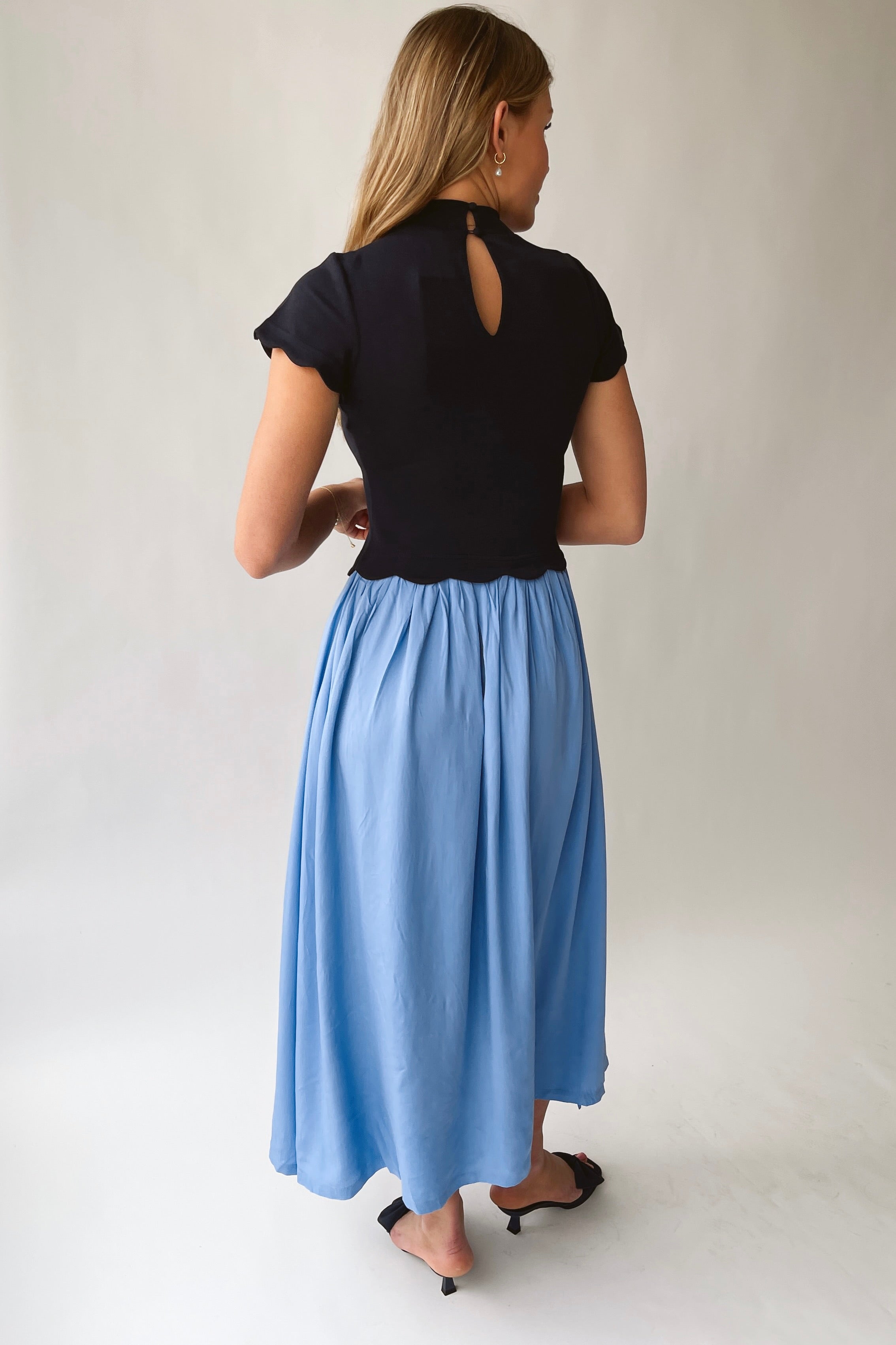 The Marby Scalloped Midi Dress in Navy