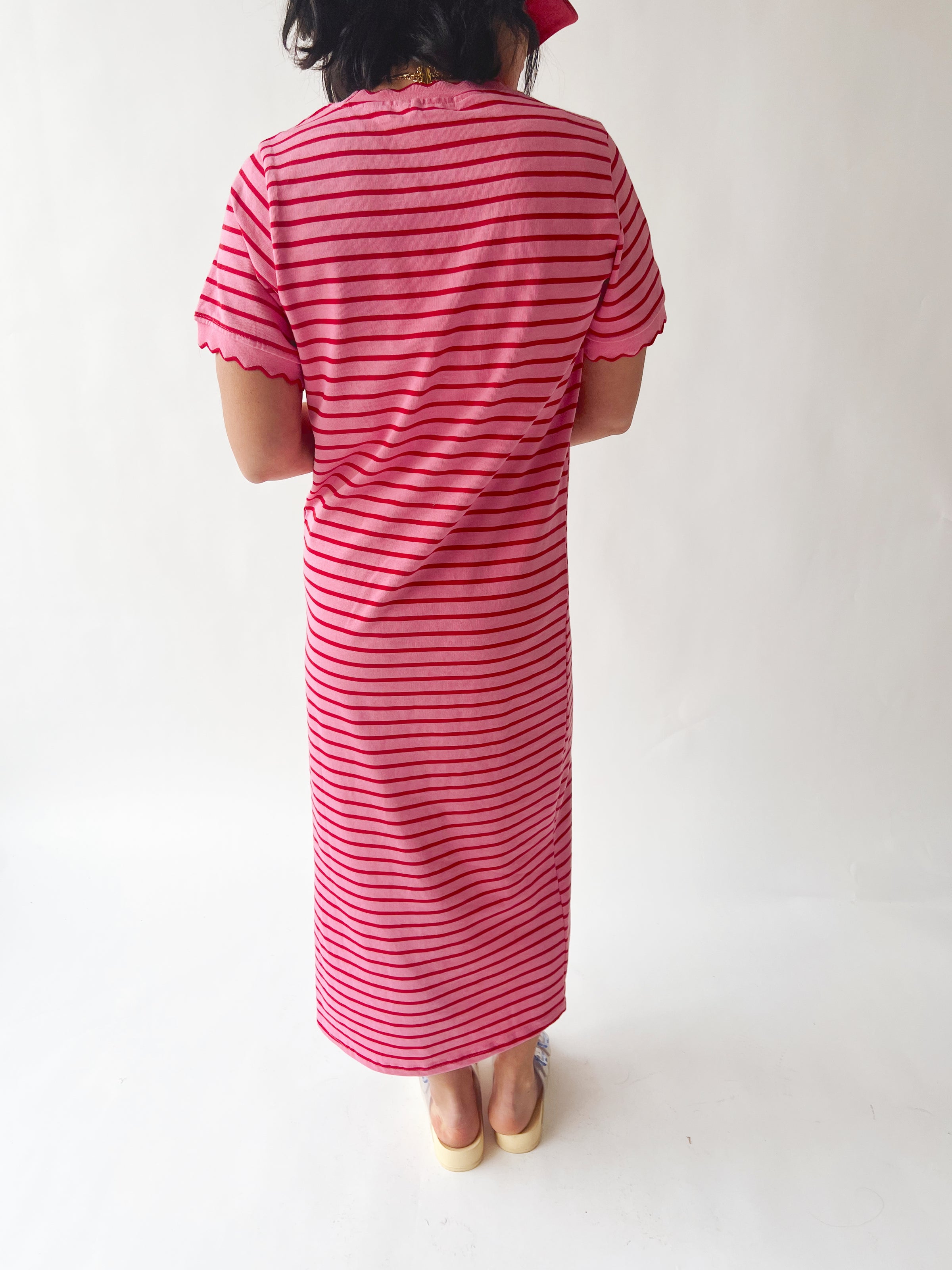 The Shipley Striped T-Shirt Midi Dress in Pink + Red